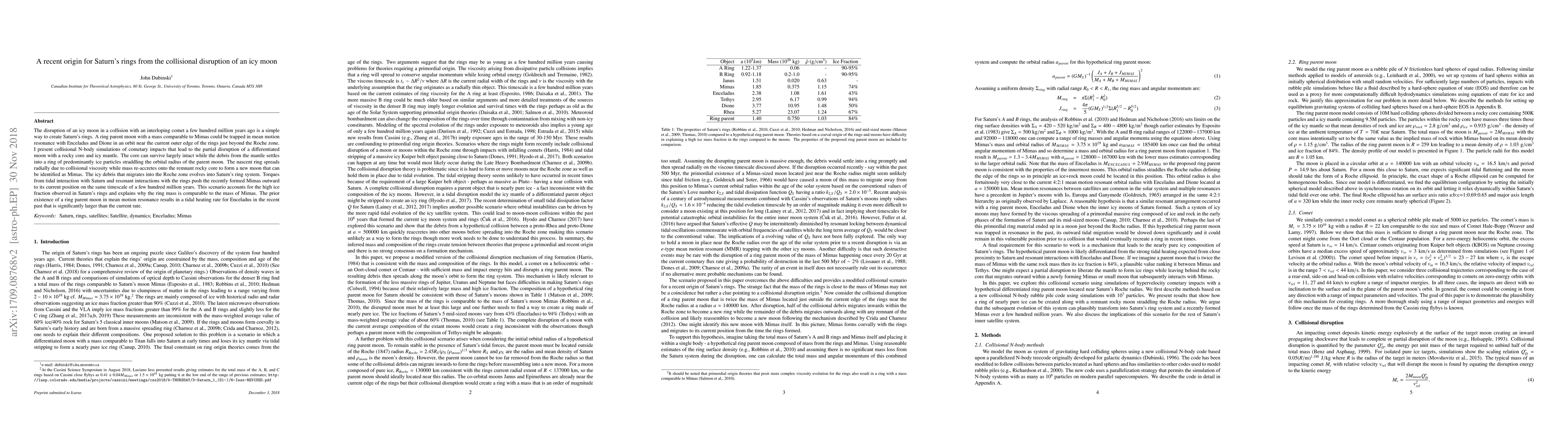 This paper proposes that Saturn's rings formed from the collisional disruption of an icy moon by a comet a few hundred million years ago, resulting in a ring composed mainly of ice particles and a remnant moon similar to Mimas. The model explains the high ice content and ring mass, and suggests a past tidal heating effect on Enceladus.