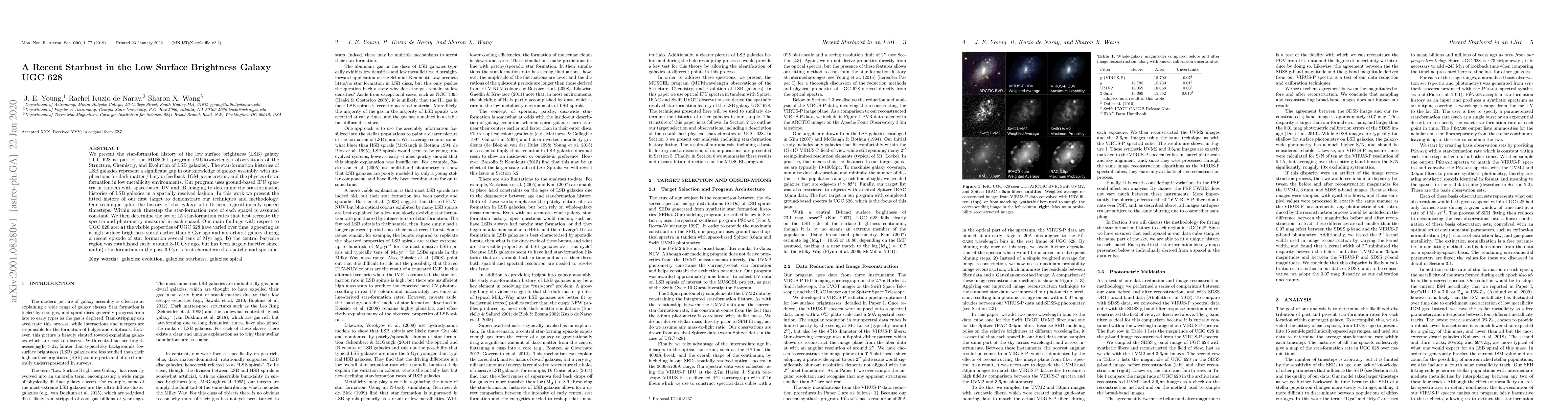We present the star-formation history of the low surface brightness (LSB) galaxy UGC 628 as part of the MUSCEL program (MUltiwavelength observations of the Structure, Chemistry, and Evolution of LSB galaxies). The star-formation histories of LSB galaxies represent a significant gap in our knowledge of galaxy assembly, with implications for dark matter / baryon feedback, IGM gas accretion, and the physics of star formation in low metallicity environments. Our program uses ground-based IFU spectra in tandem with space-based UV and IR imaging to determine the star-formation histories of LSB galaxies in a spatially resolved fashion. In this work we present the fitted history of our first target to demonstrate our techniques and methodology. Our technique splits the history of this galaxy into 15 semi-logarithmically spaced timesteps. Within each timestep the star-formation rate of each spaxel is assumed constant. We then determine the set of 15 star-formation rates that best recreate the spectra and photometry measured in each spaxel. Our main findings with respect to UGC 628 are: a) the visible properties of UGC 628 have varied over time, appearing as a high surface brightness spiral earlier than 8 Gyr ago and a starburst galaxy during a recent episode of star formation several tens of Myr ago, b) the central bar/core region was established early, around 8-10 Gyr ago, but has been largely inactive since, and c) star formation in the past 3 Gyr is best characterised as patchy and sporadic.