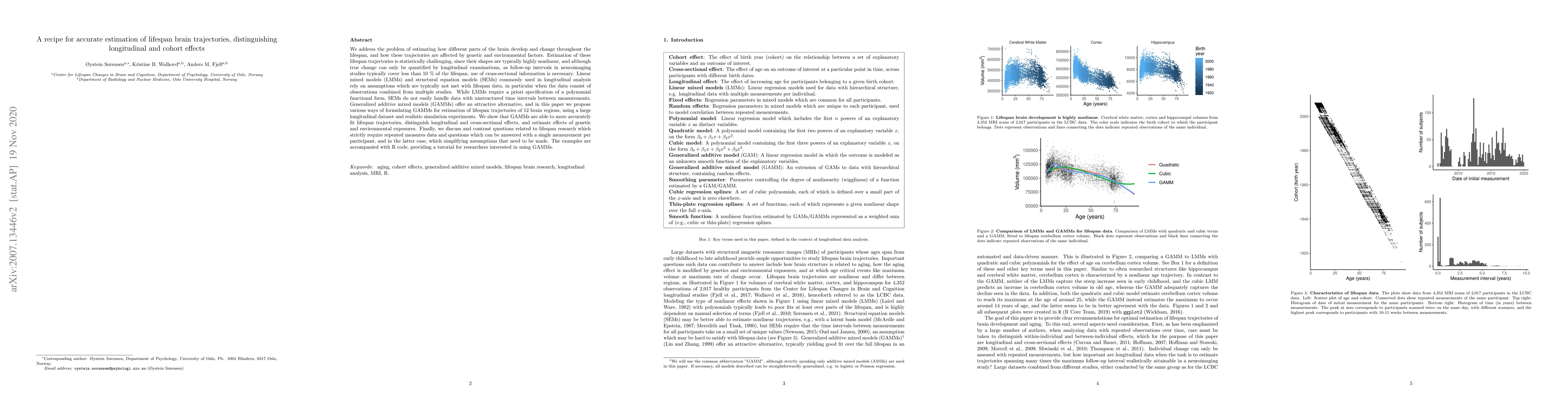 This paper proposes generalized additive mixed models (GAMMs) for accurately estimating lifespan brain trajectories, distinguishing longitudinal and cohort effects, and assessing the impact of genetic and environmental factors. The authors demonstrate that GAMMs outperform traditional linear mixed models and structural equation models by better fitting nonlinear lifespan trajectories and handling unstructured time intervals, using a large longitudinal dataset and simulation experiments.