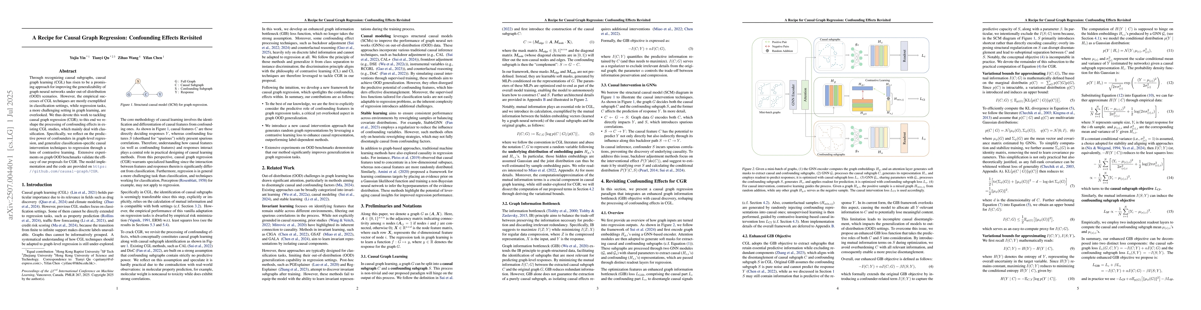 The paper proposes a method for causal graph regression (CGR) by reshaping the processing of confounding effects in existing causal graph learning (CGL) techniques, originally designed for classification tasks. It introduces an enhanced graph information bottleneck (GIB) loss function to highlight the impact of confounding effects and benefits causal subgraph recognition. The causal intervention technique is adapted for regression by removing label information and connecting it with unsupervised contrastive learning loss.