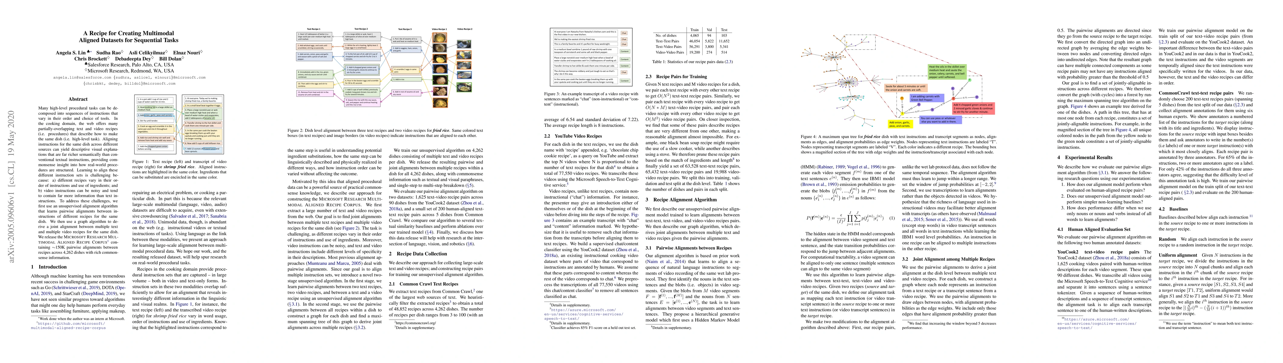 Many high-level procedural tasks can be decomposed into sequences of instructions that vary in their order and choice of tools. In the cooking domain, the web offers many partially-overlapping text and video recipes (i.e. procedures) that describe how to make the same dish (i.e. high-level task). Aligning instructions for the same dish across different sources can yield descriptive visual explanations that are far richer semantically than conventional textual instructions, providing commonsense insight into how real-world procedures are structured. Learning to align these different instruction sets is challenging because: a) different recipes vary in their order of instructions and use of ingredients; and b) video instructions can be noisy and tend to contain far more information than text instructions. To address these challenges, we first use an unsupervised alignment algorithm that learns pairwise alignments between instructions of different recipes for the same dish. We then use a graph algorithm to derive a joint alignment between multiple text and multiple video recipes for the same dish. We release the Microsoft Research Multimodal Aligned Recipe Corpus containing 150K pairwise alignments between recipes across 4,262 dishes with rich commonsense information.