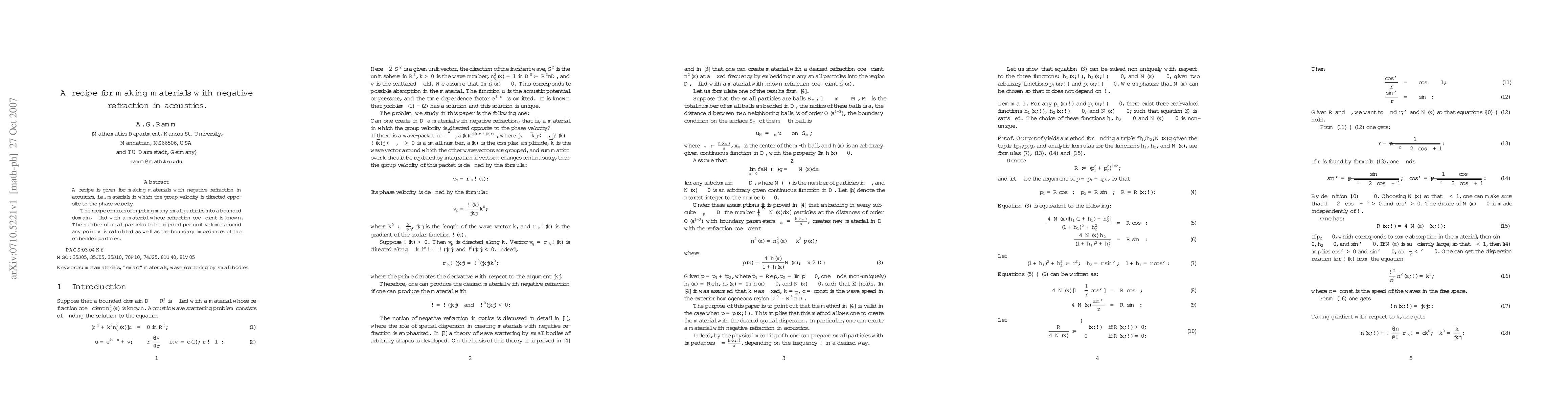A recipe is given for making materials with negative refraction in acoustics, i.e., materials in which the group velocity is directed opposite to the phase velocity. The recipe consists of injecting many small particles into a bounded domain, filled with a material whose refraction coefficient is known. The number of small particles to be injected per unit volume around any point $x$ is calculated as well as the boundary impedances of the embedded particles.