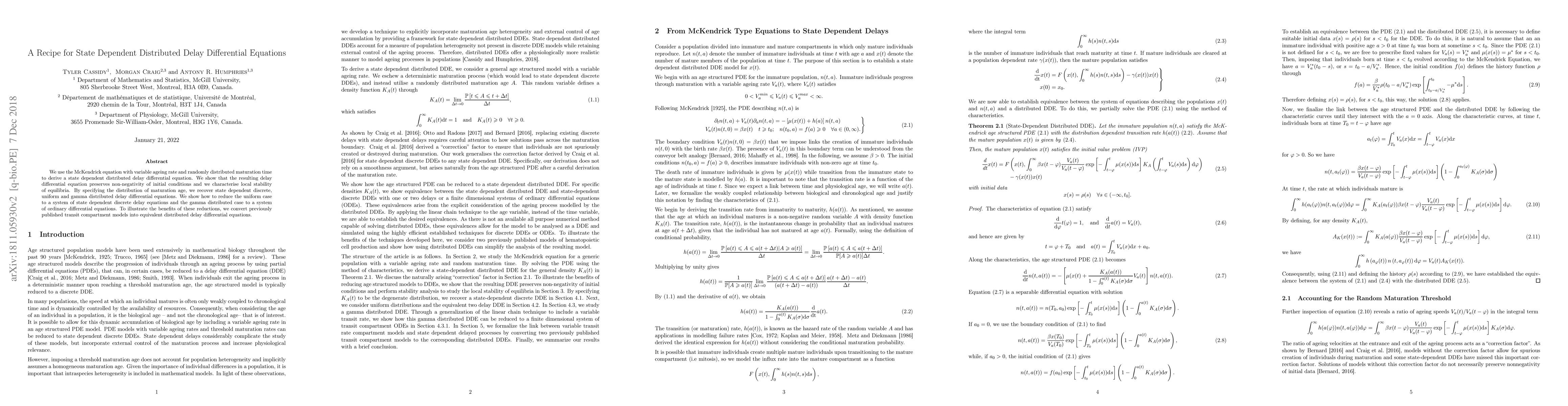 This paper derives a state dependent distributed delay differential equation from the McKendrick equation, ensuring non-negativity and characterizing local stability. It also reduces uniform and gamma distributed cases to discrete delay and ordinary differential equations, respectively, and applies these reductions to transit compartment models.