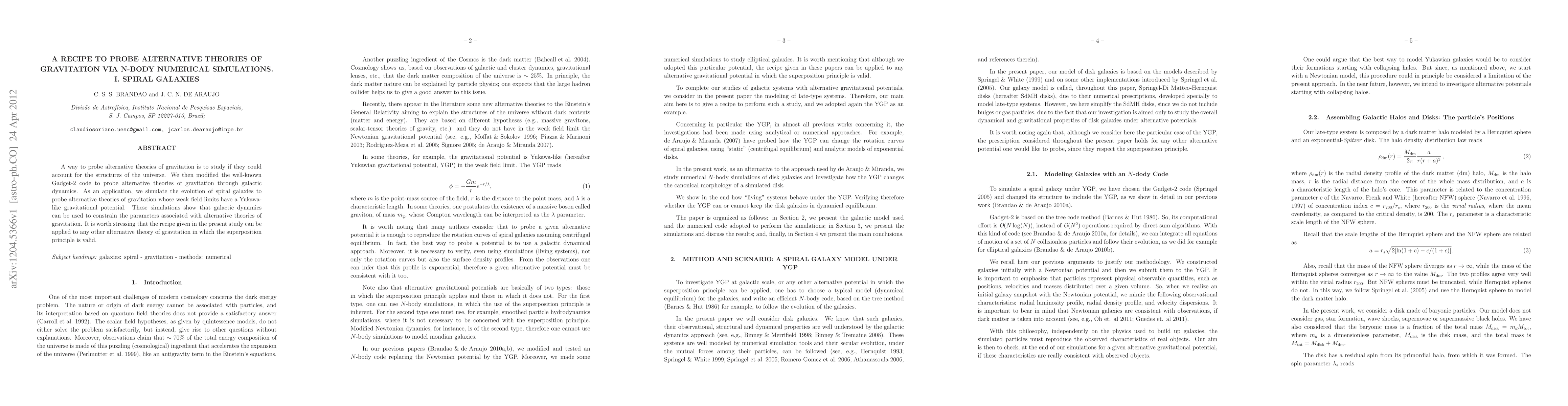 A way to probe alternative theories of gravitation is to study if they could account for the structures of the universe. We then modified the well-known Gadget-2 code to probe alternative theories of gravitation through galactic dynamics. As an application, we simulate the evolution of spiral galaxies to probe alternative theories of gravitation whose weak field limits have a Yukawa-like gravitational potential. These simulations show that galactic dynamics can be used to constrain the parameters associated with alternative theories of gravitation. It is worth stressing that the recipe given in the present study can be applied to any other alternative theory of gravitation in which the superposition principle is valid.