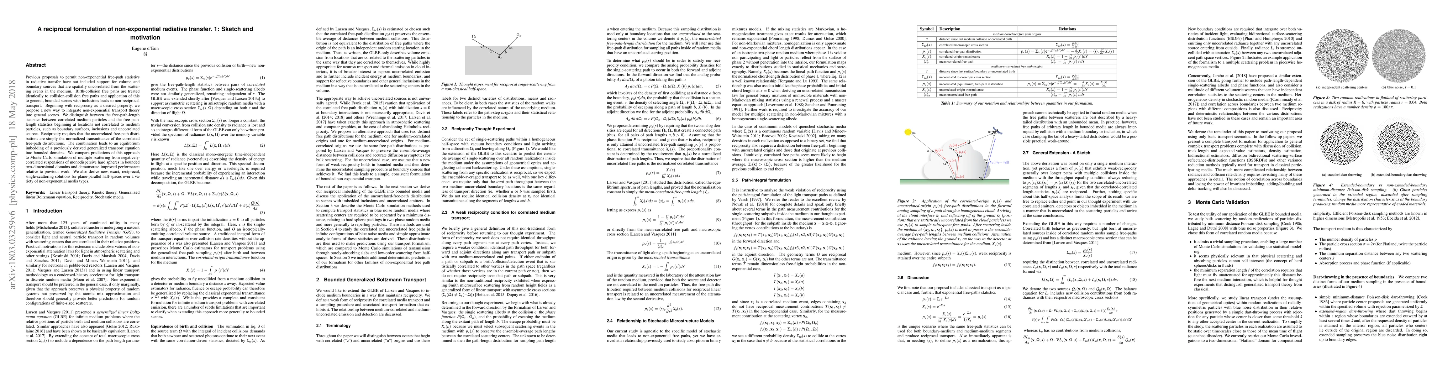 Previous proposals to permit non-exponential free-path statistics in radiative transfer have not included support for volume and boundary sources that are spatially uncorrelated from the scattering events in the medium. Birth-collision free paths are treated identically to collision-collision free paths and application of this to general, bounded scenes with inclusions leads to non-reciprocal transport. Beginning with reciprocity as a desired property, we propose a new way to integrate non-exponential transport theory into general scenes. We distinguish between the free-path-length statistics between correlated medium particles and the free-path-length statistics beginning at locations not correlated to medium particles, such as boundary surfaces, inclusions and uncorrelated sources. Reciprocity requires that the uncorrelated free-path distributions are simply the normalized transmittance of the correlated free-path distributions. The combination leads to an equilibrium imbedding of a previously derived generalized transport equation into bounded domains. We compare predictions of this approach to Monte Carlo simulation of multiple scattering from negatively-correlated suspensions of monodispersive hard spheres in bounded two-dimensional domains and demonstrate improved performance relative to previous work. We also derive new, exact, reciprocal, single-scattering solutions for plane-parallel half-spaces over a variety of non-exponential media types.