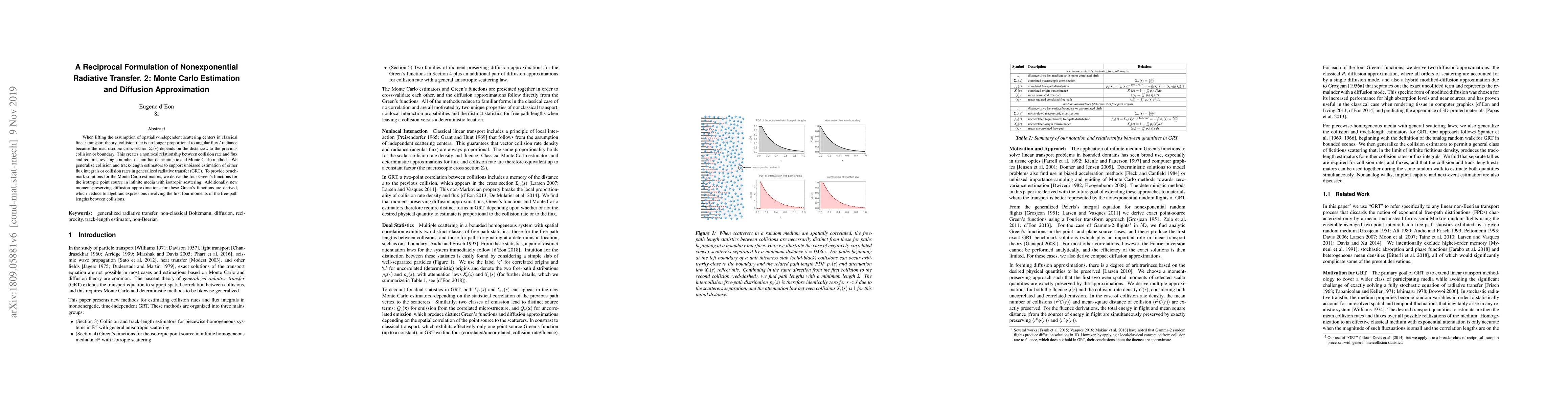 When lifting the assumption of spatially-independent scattering centers in classical linear transport theory, collision rate is no longer proportional to angular flux / radiance because the macroscopic cross-section $\Sigma_t(s)$ depends on the distance $s$ to the previous collision or boundary. We generalize collision and track-length estimators to support unbiased estimation of either flux integrals or collision rates in generalized radiative transfer (GRT). To provide benchmark solutions for the Monte Carlo estimators, we derive the four Green's functions for the isotropic point source in infinite media with isotropic scattering. Additionally, new moment-preserving diffusion approximations for these Green's functions are derived, which reduce to algebraic expressions involving the first four moments of the free-path lengths between collisions.