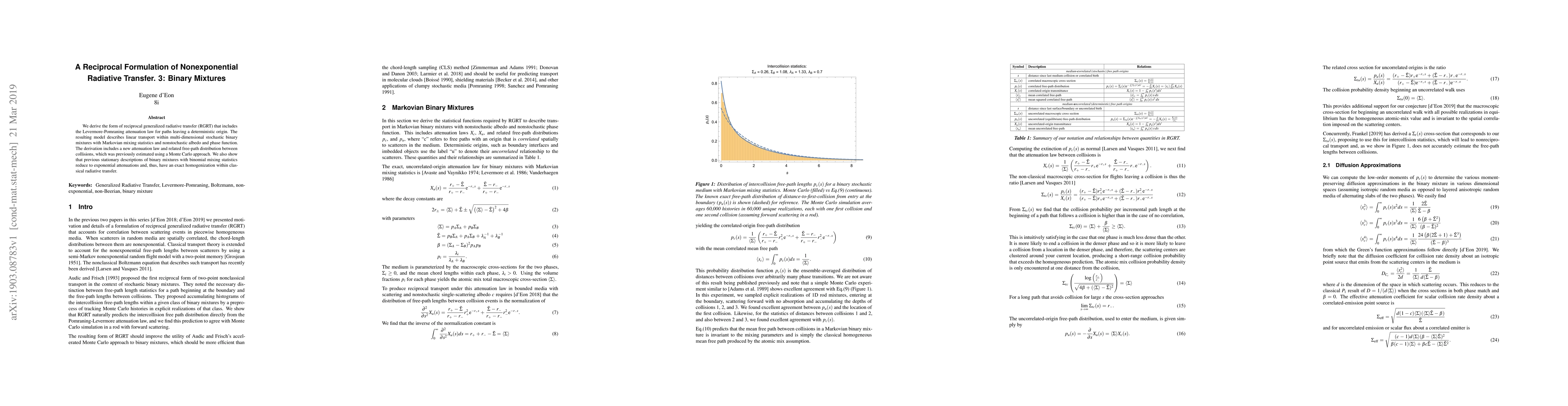 We derive the form of reciprocal generalized radiative transfer (RGRT) that includes the Levermore-Pomraning attenuation law for paths leaving a deterministic origin. The resulting model describes linear transport within multi-dimensional stochastic binary mixtures with Markovian mixing statistics and nonstochastic albedo and phase function. The derivation includes a new attenuation law and related free-path distribution between collisions, which was previously estimated using a Monte Carlo approach. We also show that previous stationary descriptions of binary mixtures with binomial mixing statistics reduce to exponential attenuations and, thus, have an exact homogenization within classical radiative transfer.