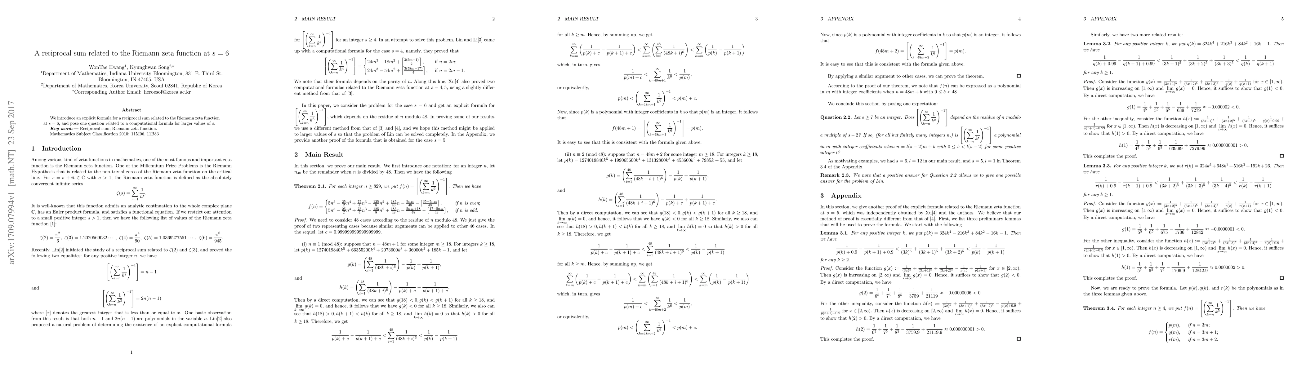Summary: This paper presents an explicit formula for a reciprocal sum connected to the Riemann zeta function evaluated at s=6, and proposes a question regarding computational methods for larger values of s.
