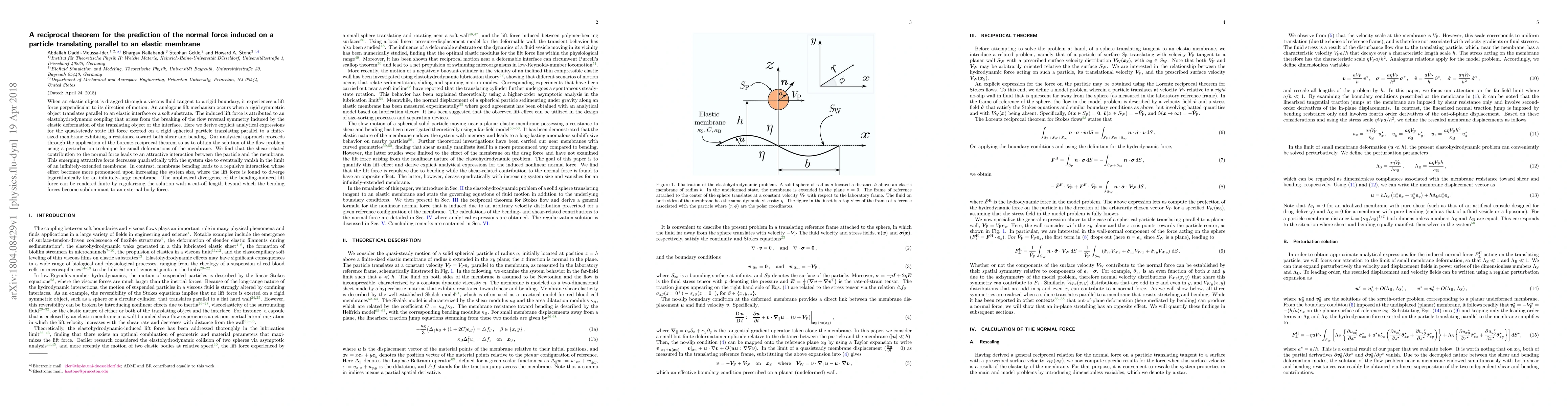 When an elastic object is dragged through a viscous fluid tangent to a rigid boundary, it experiences a lift force perpendicular to its direction of motion. An analogous lift mechanism occurs when a rigid symmetric object translates parallel to an elastic interface or a soft substrate. The induced lift force is attributed to an elastohydrodynamic coupling that arises from the breaking of the flow reversal symmetry induced by the elastic deformation of the translating object or the interface. Here we derive explicit analytical expressions for the quasi-steady state lift force exerted on a rigid spherical particle translating parallel to a finite-sized membrane exhibiting a resistance toward both shear and bending. Our analytical approach proceeds through the application of the Lorentz reciprocal theorem so as to obtain the solution of the flow problem using a perturbation technique for small deformations of the membrane. We find that the shear-related contribution to the normal force leads to an attractive interaction between the particle and the membrane. This emerging attractive force decreases quadratically with the system size to eventually vanish in the limit of an infinitely-extended membrane. In contrast, membrane bending leads to a repulsive interaction whose effect becomes more pronounced upon increasing the system size, where the lift force is found to diverge logarithmically for an infinitely-large membrane. The unphysical divergence of the bending-induced lift force can be rendered finite by regularizing the solution with a cut-off length beyond which the bending forces become subdominant to an external body force.