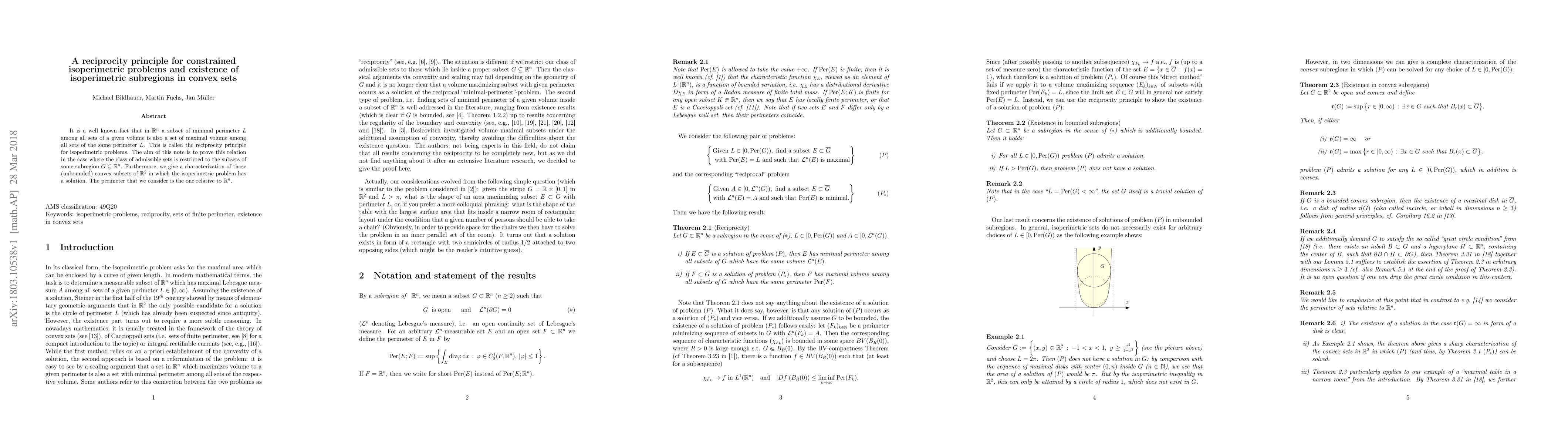 This paper proves a reciprocity principle for isoperimetric problems in convex sets restricted to subregions of $ $ space, showing that minimal perimeter subsets also have maximal volume.