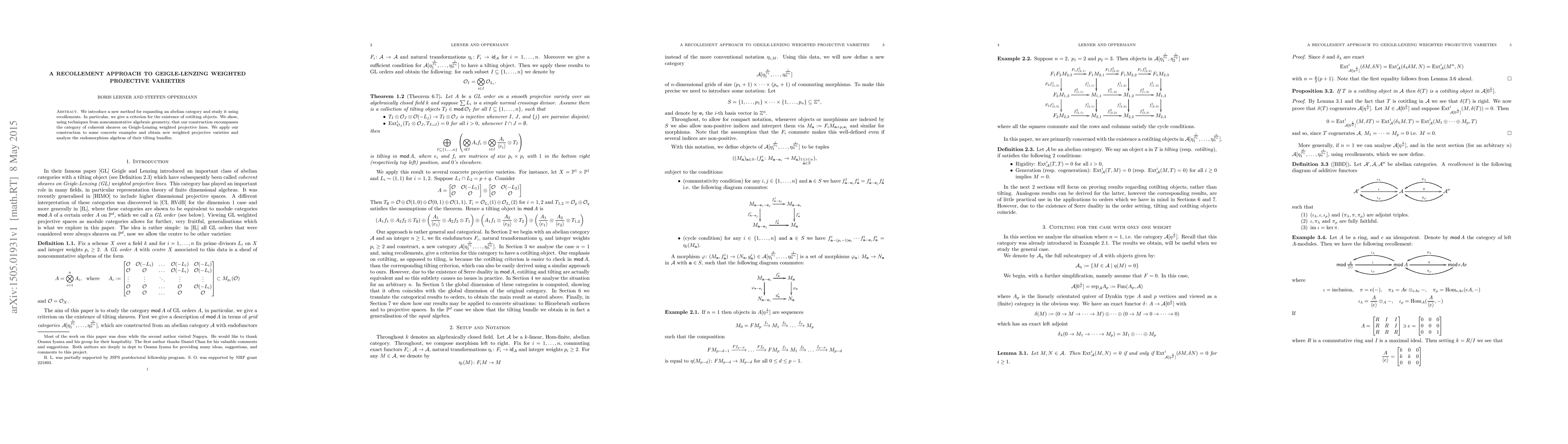 We introduce a new method for expanding an abelian category and study it using recollements. In particular, we give a criterion for the existence of cotilting objects. We show, using techniques from noncommutative algebraic geometry, that our construction encompasses the category of coherent sheaves on Geigle-Lenzing weighted projective lines. We apply our construction to some concrete examples and obtain new weighted projective varieties and analyse the endomorphism algebras of their tilting bundles.