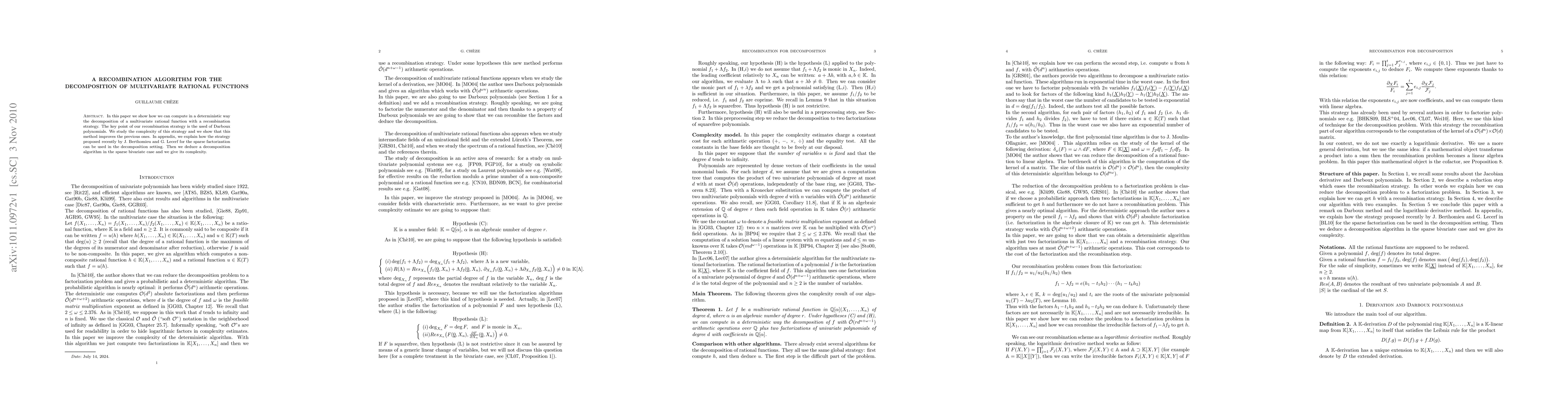 This paper introduces a new recombination strategy using Darboux polynomials to decompose multivariate rational functions in a deterministic way, improving on previous methods.