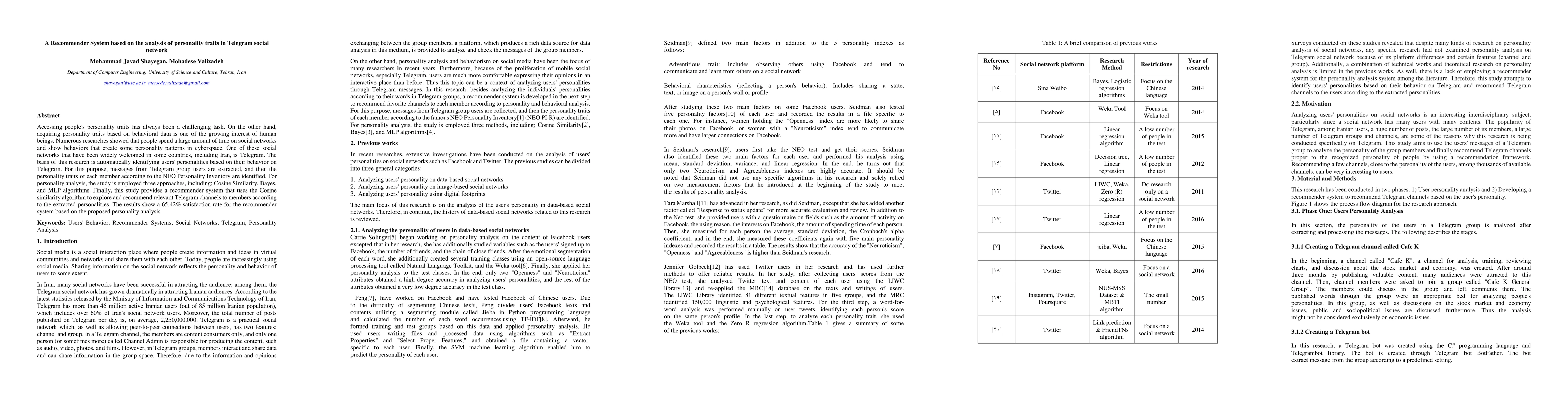 Accessing people's personality traits has always been a challenging task. On the other hand, acquiring personality traits based on behavioral data is one of the growing interest of human beings. Numerous researches showed that people spend a large amount of time on social networks and show behaviors that create some personality patterns in cyberspace. One of these social networks that have been widely welcomed in some countries, including Iran, is Telegram. The basis of this research is automatically identifying users' personalities based on their behavior on Telegram. For this purpose, messages from Telegram group users are extracted, and then the personality traits of each member according to the NEO Personality Inventory are identified. For personality analysis, the study is employed three approaches, including; Cosine Similarity, Bayes, and MLP algorithms. Finally, this study provides a recommender system that uses the Cosine similarity algorithm to explore and recommend relevant Telegram channels to members according to the extracted personalities. The results show a 65.42% satisfaction rate for the recommender system based on the proposed personality analysis.