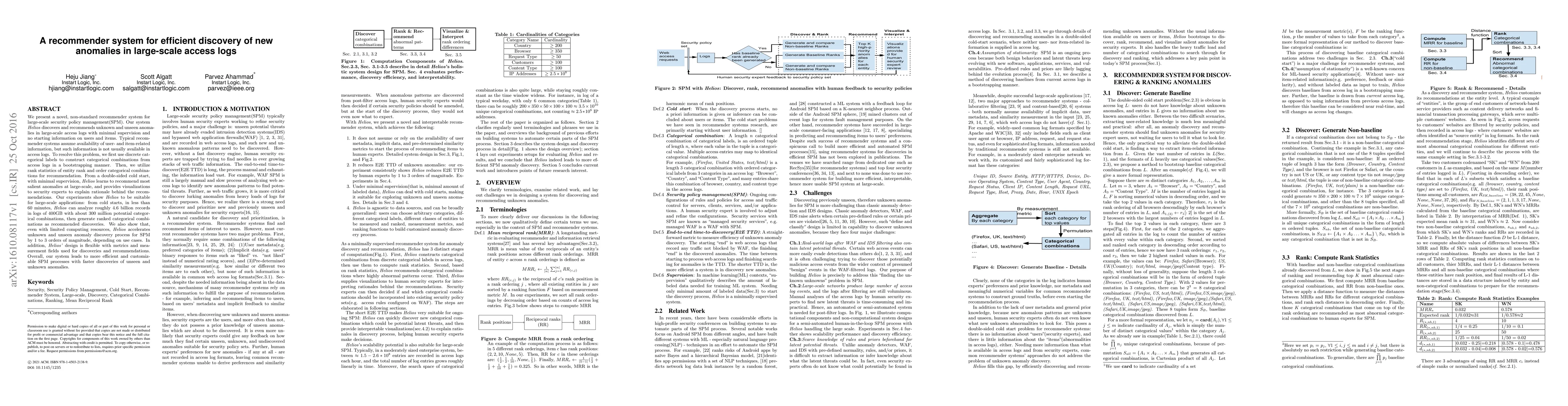 The research introduces Helios, a novel recommender system for large-scale Security Policy Management (SPM) that discovers and recommends unknown anomalies in access logs with minimal supervision and no prior information on users and items. It constructs categorical combinations from logs using discrete categorical labels and utilizes rank statistics for recommendations.