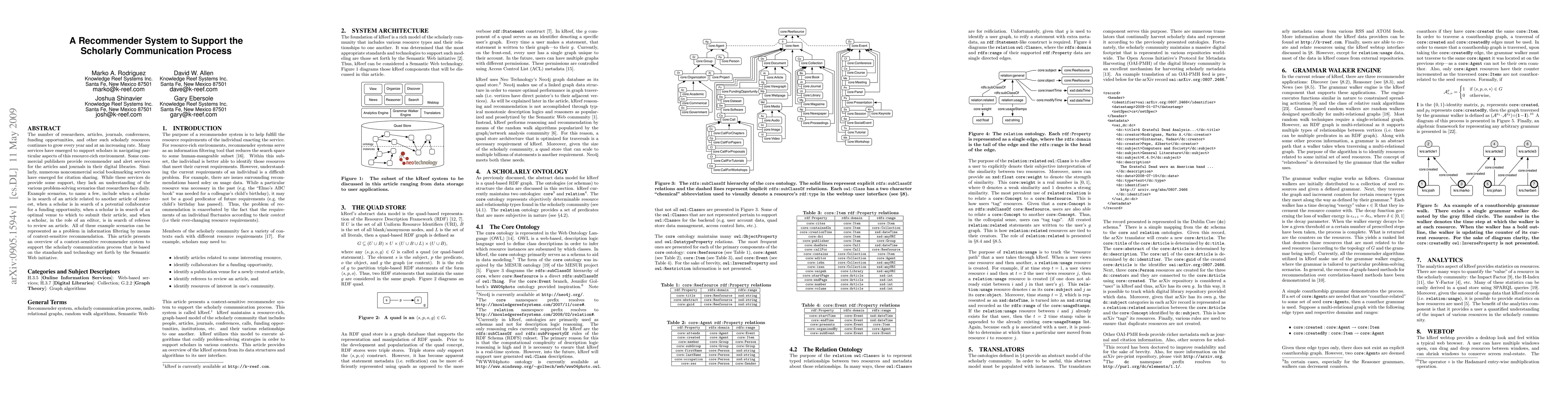 The number of researchers, articles, journals, conferences, funding opportunities, and other such scholarly resources continues to grow every year and at an increasing rate. Many services have emerged to support scholars in navigating particular aspects of this resource-rich environment. Some commercial publishers provide recommender and alert services for the articles and journals in their digital libraries. Similarly, numerous noncommercial social bookmarking services have emerged for citation sharing. While these services do provide some support, they lack an understanding of the various problem-solving scenarios that researchers face daily. Example scenarios, to name a few, include when a scholar is in search of an article related to another article of interest, when a scholar is in search of a potential collaborator for a funding opportunity, when a scholar is in search of an optimal venue to which to submit their article, and when a scholar, in the role of an editor, is in search of referees to review an article. All of these example scenarios can be represented as a problem in information filtering by means of context-sensitive recommendation. This article presents an overview of a context-sensitive recommender system to support the scholarly communication process that is based on the standards and technology set forth by the Semantic Web initiative.