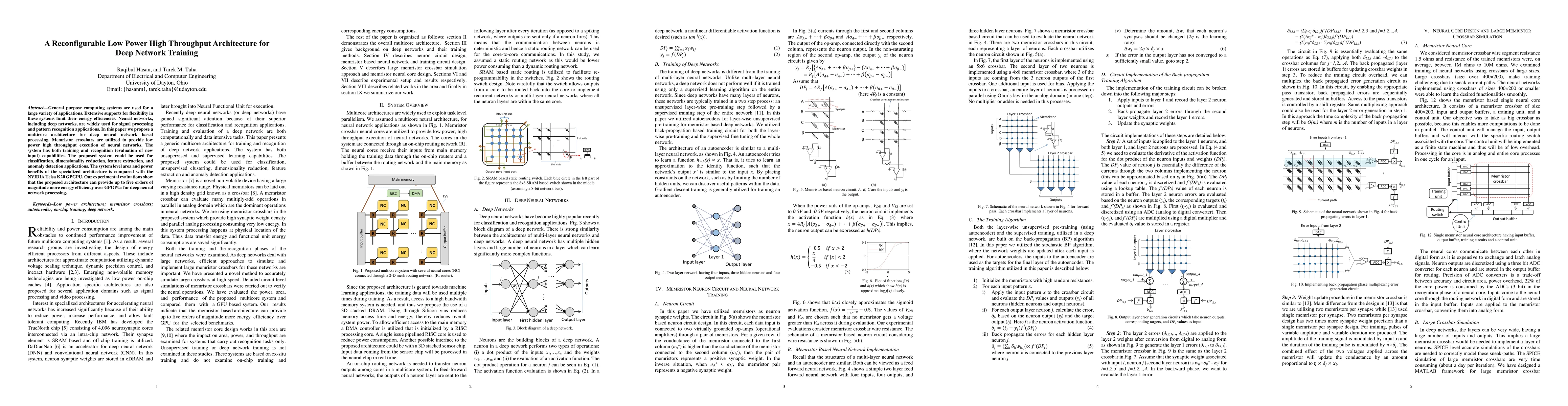 This paper proposes a multicore architecture utilizing memristor crossbars for low power, high throughput deep neural network training and evaluation, achieving up to five orders of magnitude more energy efficiency compared to GPGPUs like the NVIDIA Tesla K20. The architecture supports applications such as classification, dimensionality reduction, and anomaly detection.