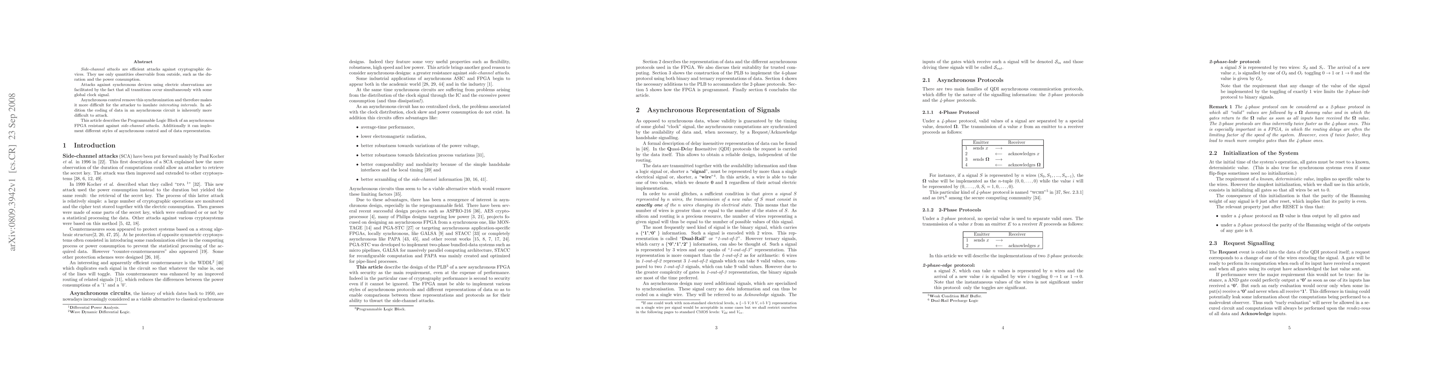 Side-channel attacks are efficient attacks against cryptographic devices. They use only quantities observable from outside, such as the duration and the power consumption. Attacks against synchronous devices using electric observations are facilitated by the fact that all transitions occur simultaneously with some global clock signal. Asynchronous control remove this synchronization and therefore makes it more difficult for the attacker to insulate \emph{interesting intervals}. In addition the coding of data in an asynchronous circuit is inherently more difficult to attack. This article describes the Programmable Logic Block of an asynchronous FPGA resistant against \emph{side-channel attacks}. Additionally it can implement different styles of asynchronous control and of data representation.