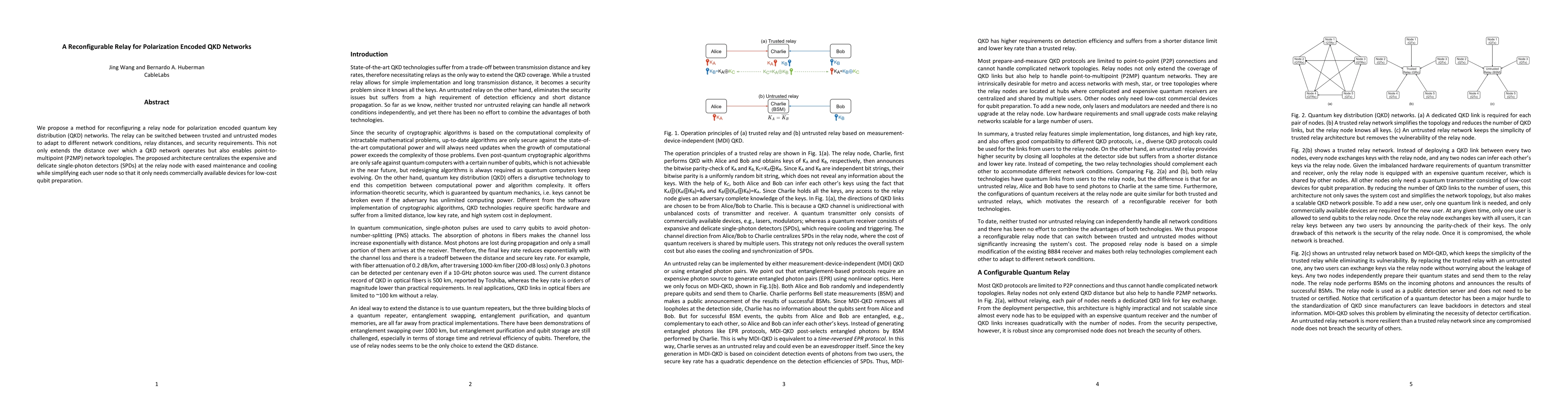 We propose a method for reconfiguring a relay node for polarization encoded quantum key distribution (QKD) networks. The relay can be switched between trusted and untrusted modes to adapt to different network conditions, relay distances, and security requirements. This not only extends the distance over which a QKD network operates but also enables point-to-multipoint (P2MP) network topologies. The proposed architecture centralizes the expensive and delicate single-photon detectors (SPDs) at the relay node with eased maintenance and cooling while simplifying each user node so that it only needs commercially available devices for low-cost qubit preparation.