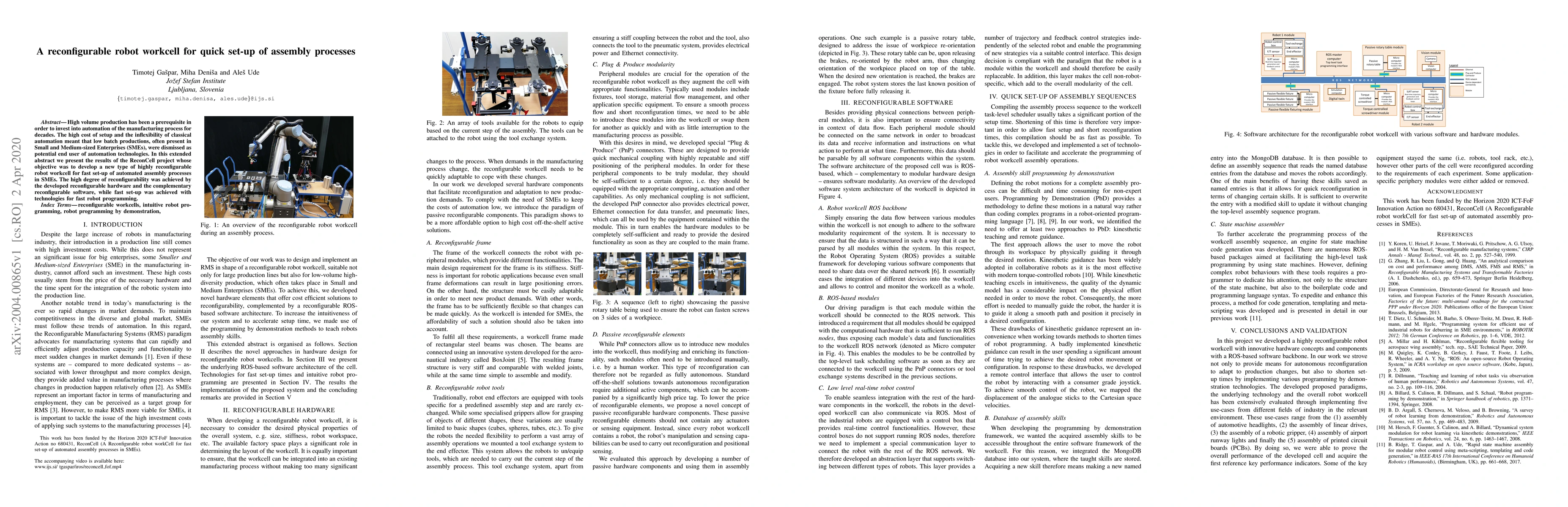 High volume production has been a prerequisite in order to invest into automation of the manufacturing process for decades. The high cost of setup and the inflexibility of classical automation meant that low batch productions, often present in Small and Medium-sized Enterprises (SMEs), were dismissed as potential end user of automation technologies. In this extended abstract we present the results of the ReconCell project whose objective was to develop a new type of highly reconfigurable robot workcell for fast set-up of automated assembly processes in SMEs. The high degree of reconfigurability was achieved by the developed reconfigurable hardware and the complementary reconfigurable software, while fast set-up was achieved with technologies for fast robot programming.