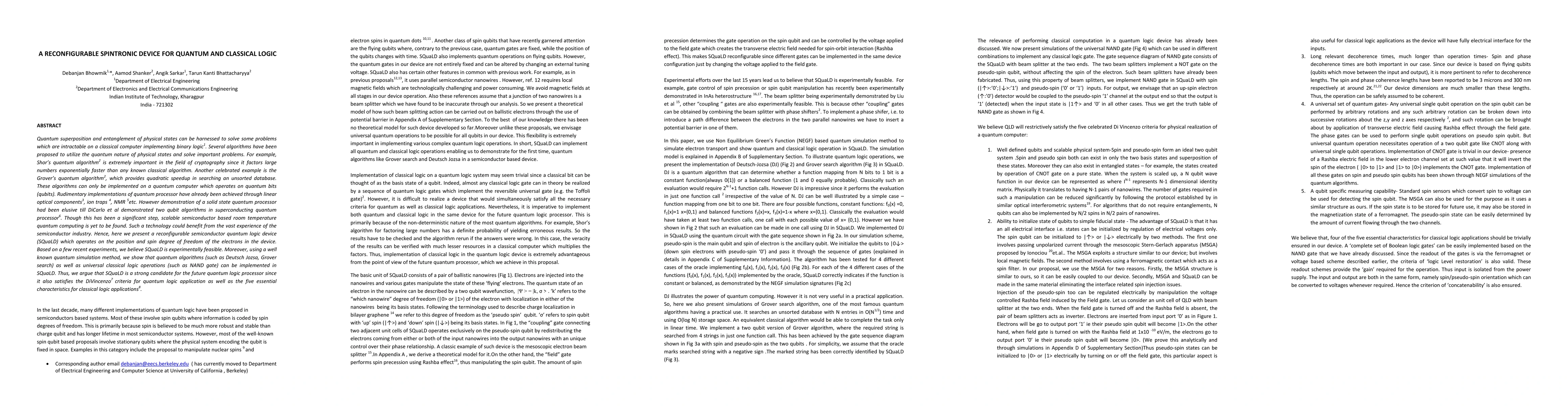 Quantum superposition and entanglement of physical states can be harnessed to solve some problems which are intractable on a classical computer implementing binary logic. Several algorithms have been proposed to utilize the quantum nature of physical states and solve important problems. For example, Shor's quantum algorithm is extremely important in the field of cryptography since it factors large numbers exponentially faster than any known classical algorithm. Another celebrated example is the Grovers quantum algorithm. These algorithms can only be implemented on a quantum computer which operates on quantum bits (qubits). Rudimentary implementations of quantum processor have already been achieved through linear optical components, ion traps, NMR etc. However demonstration of a solid state quantum processor had been elusive till DiCarlo et al demonstrated two qubit algorithms in superconducting quantum processor. Though this has been a significant step, scalable semiconductor based room temperature quantum computing is yet to be found. Such a technology could benefit from the vast experience of the semiconductor industry. Hence, here we present a reconfigurable semiconductor quantum logic device (SQuaLD) which operates on the position and spin degree of freedom of the electrons in the device. Based on a few recent experiments, we believe SQuaLD is experimentally feasible. Moreover, using a well known quantum simulation method, we show that quantum algorithms (such as Deutsch Jozsa, Grover search) as well as universal classical logic operations (such as NAND gate) can be implemented in SQuaLD. Thus, we argue that SQuaLD is a strong candidate for the future quantum logic processor since it also satisfies the DiVincenzo criteria for quantum logic application as well as the five essential characteristics for classical logic applications.