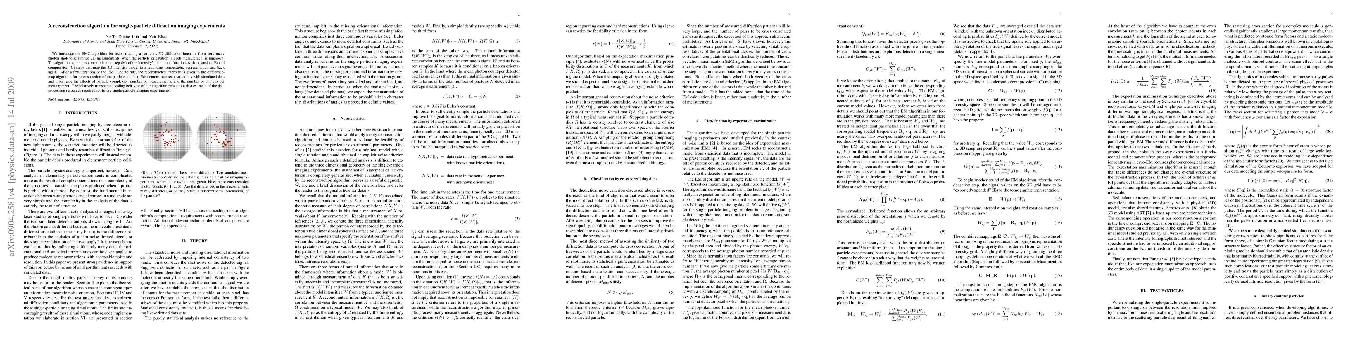 The EMC algorithm reconstructs a particle's 3D diffraction intensity from numerous 2D photon shot-noise limited measurements, even when particle orientation is unknown. It iteratively combines maximization, expansion, and compression steps to refine the 3D intensity model, followed by contrast reconstruction using the difference-map algorithm.
