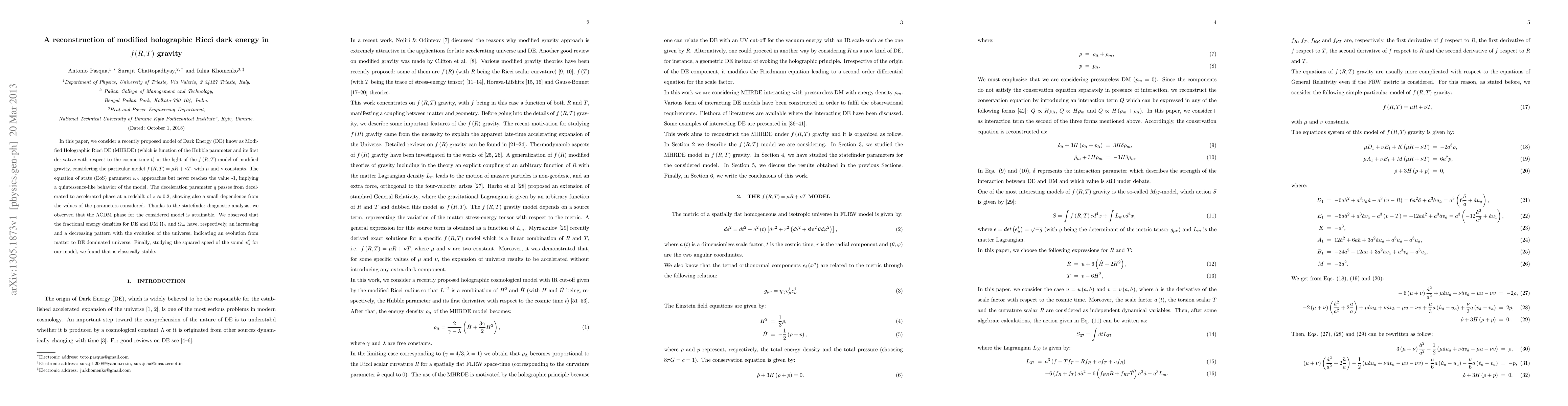 This paper reconstructs Modified Holographic Ricci Dark Energy in $f(R,T)$ gravity, showing a quintessence-like behavior with the deceleration parameter passing from decelerated to accelerated phase at $z hickapprox 0.2$.
