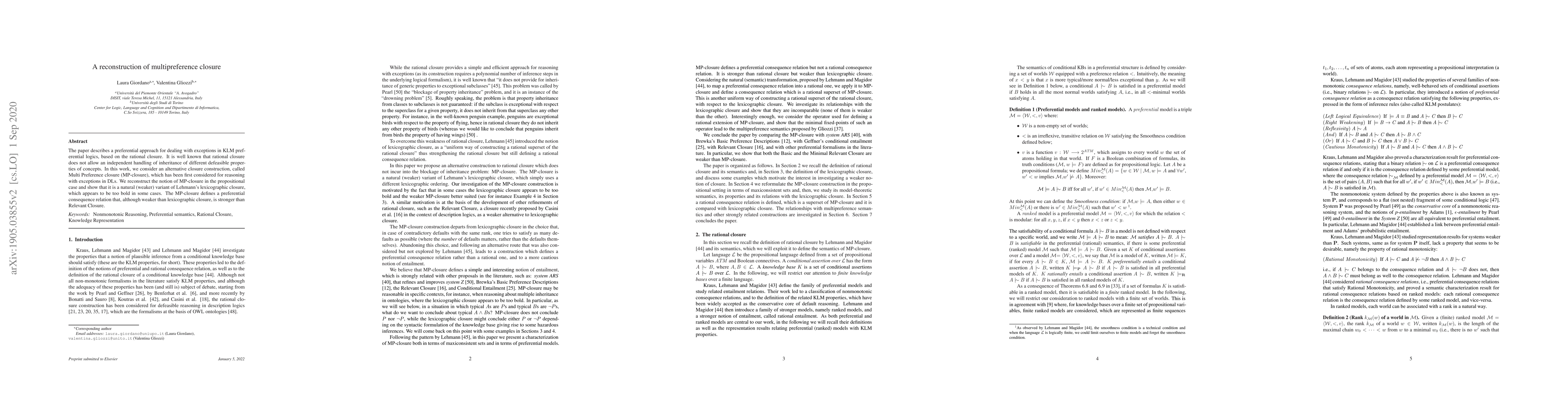 This paper reconstructs the Multi Preference closure (MP-closure) in the propositional case, demonstrating it as a variant of Lehmann's lexicographic closure. It shows that abandoning Maximal Entropy leads to a preferential consequence relation that is stronger than the rational closure but incomparable with the lexicographic closure.