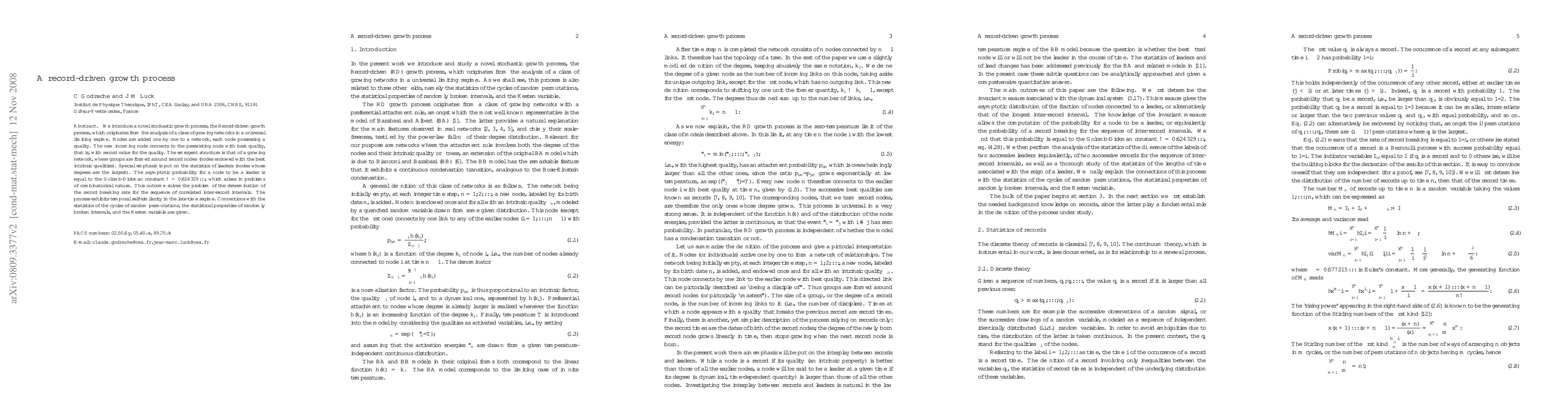We introduce a novel stochastic growth process, the record-driven growth process, which originates from the analysis of a class of growing networks in a universal limiting regime. Nodes are added one by one to a network, each node possessing a quality. The new incoming node connects to the preexisting node with best quality, that is, with record value for the quality. The emergent structure is that of a growing network, where groups are formed around record nodes (nodes endowed with the best intrinsic qualities). Special emphasis is put on the statistics of leaders (nodes whose degrees are the largest). The asymptotic probability for a node to be a leader is equal to the Golomb-Dickman constant omega=0.624329... which arises in problems of combinatorical nature. This outcome solves the problem of the determination of the record breaking rate for the sequence of correlated inter-record intervals. The process exhibits temporal self-similarity in the late-time regime. Connections with the statistics of the cycles of random permutations, the statistical properties of randomly broken intervals, and the Kesten variable are given.