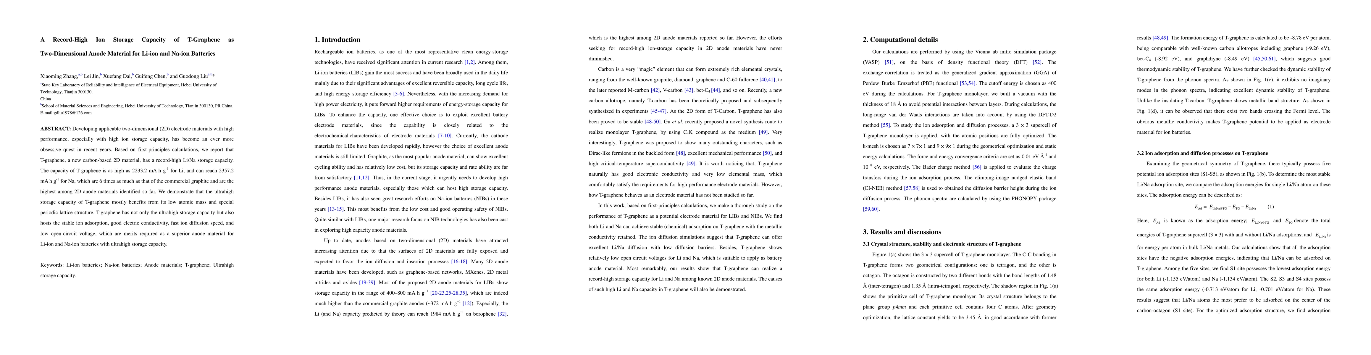 This paper reports that T-graphene, a new two-dimensional carbon-based material, exhibits a record-high ion storage capacity for both lithium and sodium ions, significantly surpassing commercial graphite and other 2D anode materials, due to its unique lattice structure and low atomic mass. It also possesses stable ion adsorption, good conductivity, and fast ion diffusion.