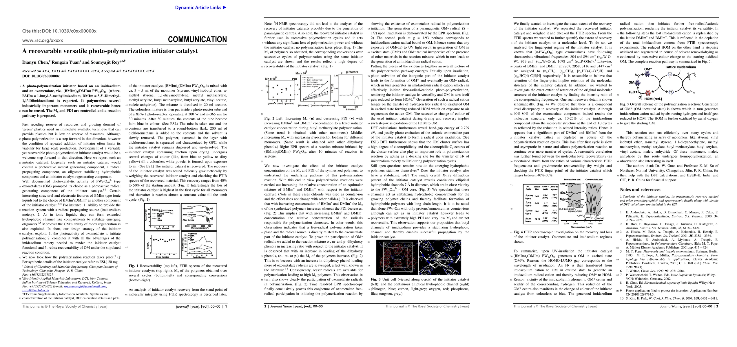 A photo-polymerization initiator based on an imidazolium and an oxometalate, viz., (BMIm)2(DMIm) PW12O40 (where, BMIm = 1-butyl-3-methylimizodium, DMIm = 3,3'-Dimethyl-1,1'-Diimidazolium) is reported. It polymerizes several industrially important monomers and is recoverable hence can be reused. The Mn and PDI are controlled and a reaction pathway is proposed.