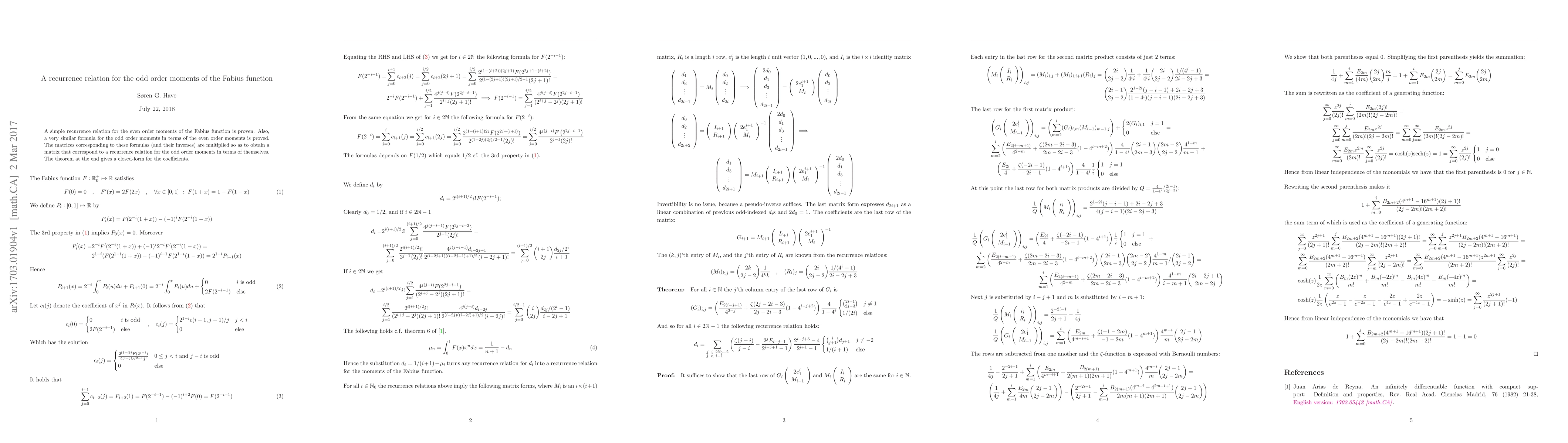 A simple recurrence relation for the even order moments of the Fabius function is proven. Also, a very similar formula for the odd order moments in terms of the even order moments is proved. The matrices corresponding to these formulas (and their inverses) are multiplied so as to obtain a matrix that correspond to a recurrence relation for the odd order moments in terms of themselves. The theorem at the end gives a closed-form for the coefficients.