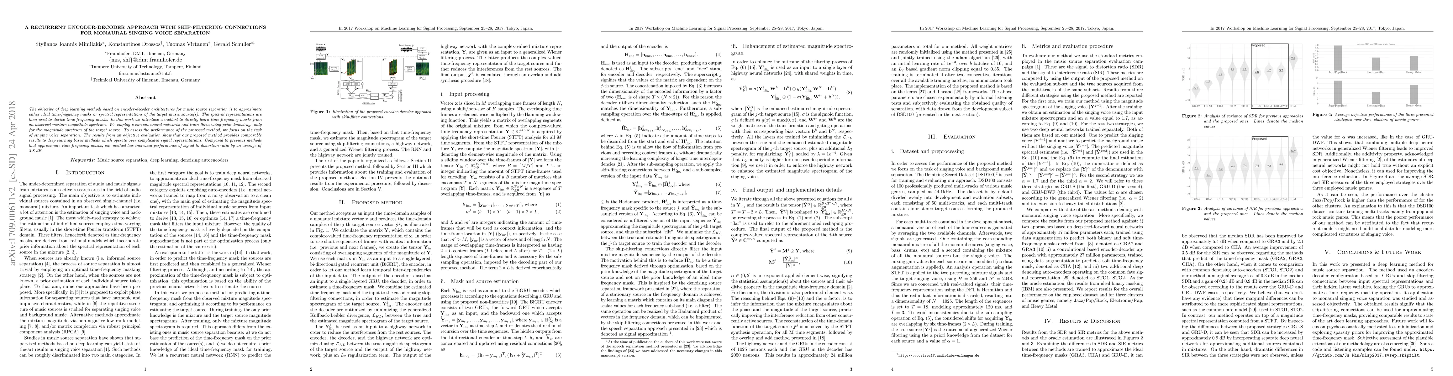 This paper proposes a recurrent encoder-decoder approach with skip-filtering for monaural singing voice separation, directly learning time-frequency masks from mixture magnitude spectra. The method shows improved performance, achieving a 3.8 dB higher signal to distortion ratio compared to previous mask approximation techniques.
