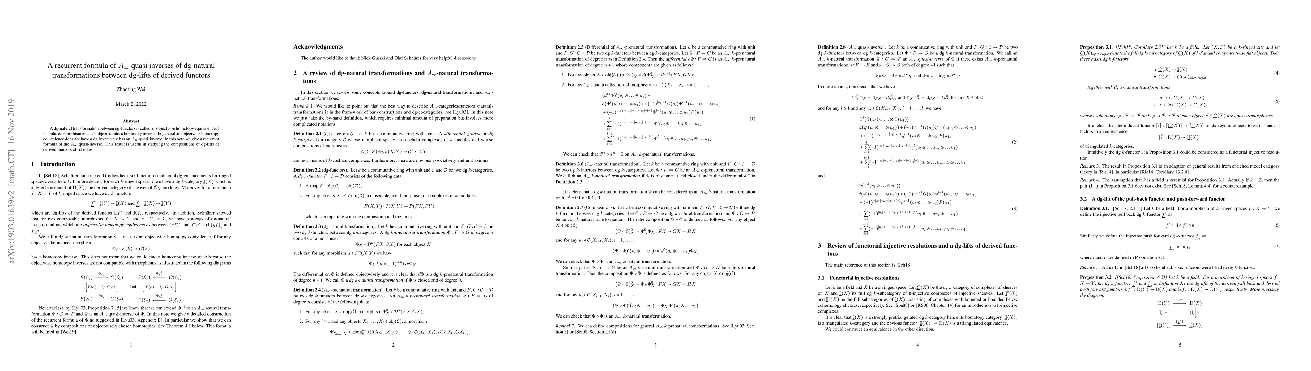 The paper provides a recurrent formula for $A_{\infty}$-quasi inverses of dg-natural transformations that are objectwise homotopy equivalences. This formula is beneficial for analyzing the compositions of dg-lifts of derived functors in scheme theory.