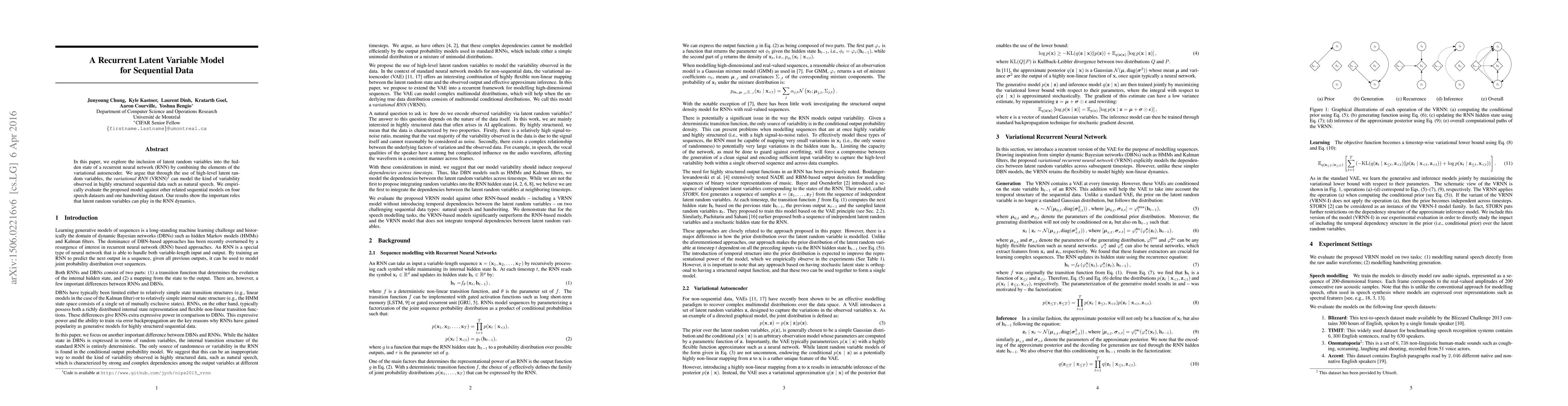 This paper proposes a variational RNN (VRNN) that incorporates latent random variables to model variability in sequential data, such as natural speech. The model's effectiveness is demonstrated through empirical evaluations on speech and handwriting datasets, showing the benefits of latent variables in capturing complex dynamics.