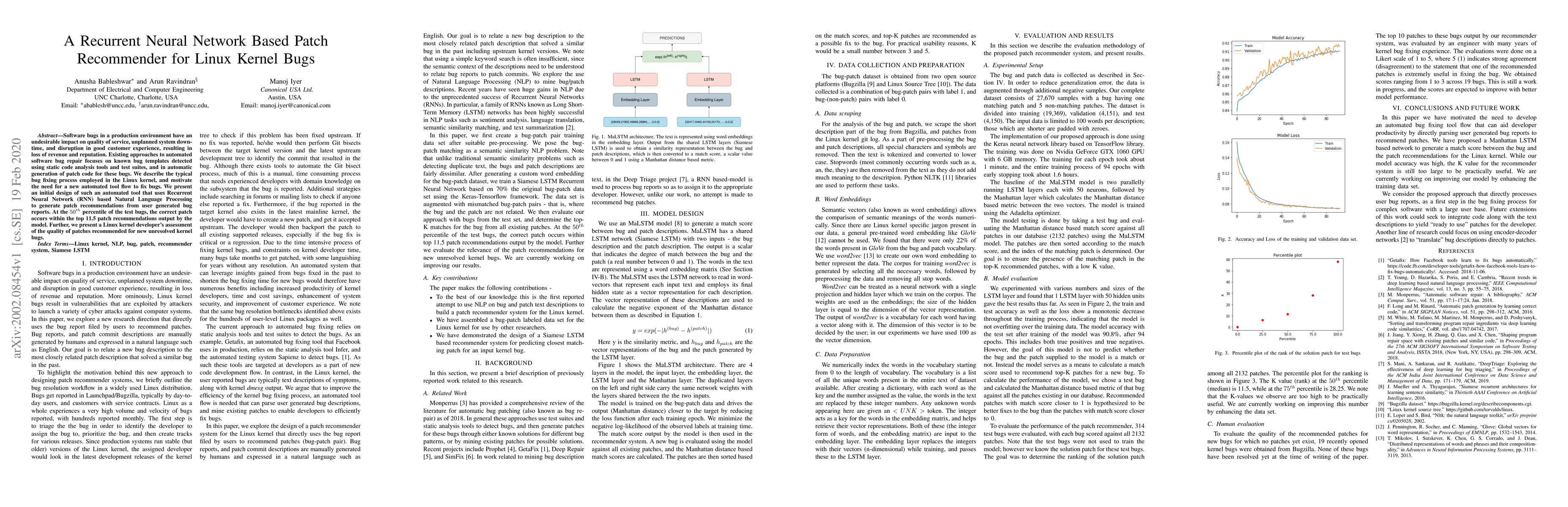 This paper introduces an RNN-based patch recommender system to automate Linux kernel bug fixes by generating patch recommendations from user-generated bug reports. The model shows promising results, with the correct patch appearing in the top 11.5 recommendations for half of the test bugs, and receives positive feedback from Linux kernel developers.