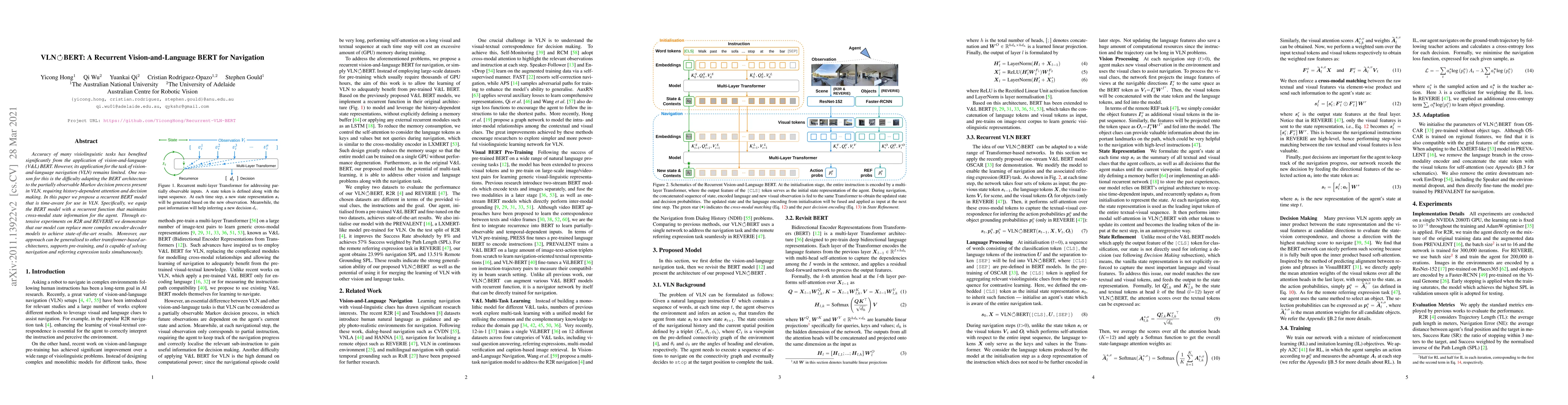 This paper proposes a recurrent vision-and-language BERT model for vision-and-language navigation (VLN), incorporating time-aware recurrent functions to handle the partially observable Markov decision process. The approach achieves state-of-the-art results on R2R and REVERIE datasets, demonstrating its potential for broader applications.