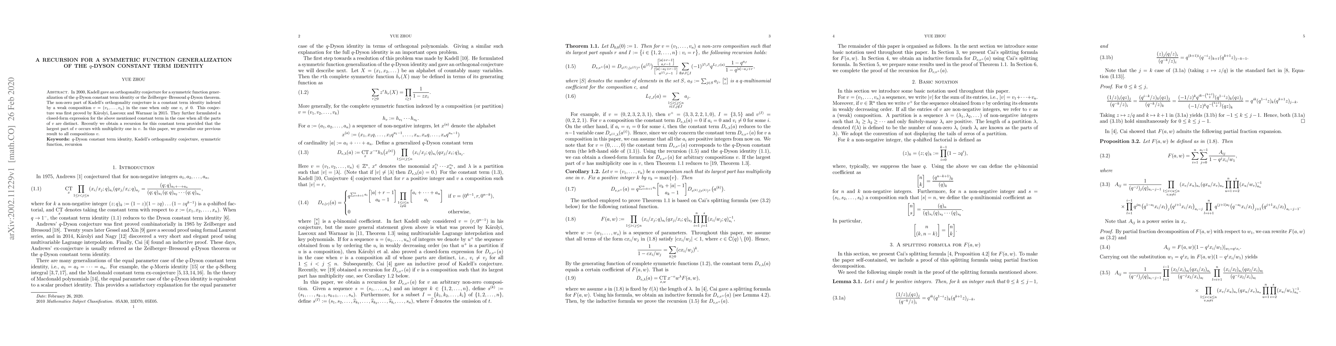 This paper presents a recursion for a symmetric function generalization of the $q$-Dyson constant term identity, extending previous results to all compositions where the largest part occurs with multiplicity one. The authors further generalize the recursion to all compositions, building on earlier work by Károlyi, Lascoux, and Warnaar.
