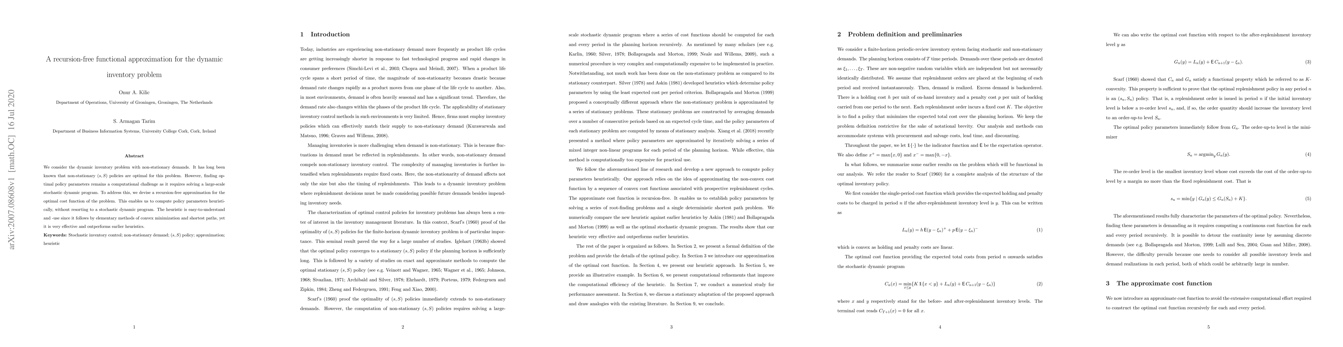 This paper proposes a recursion-free functional approximation for the dynamic inventory problem with non-stationary demands, enabling heuristic computation of optimal policy parameters without solving a large-scale stochastic dynamic program. The method uses convex minimization and shortest paths, outperforming previous heuristics.