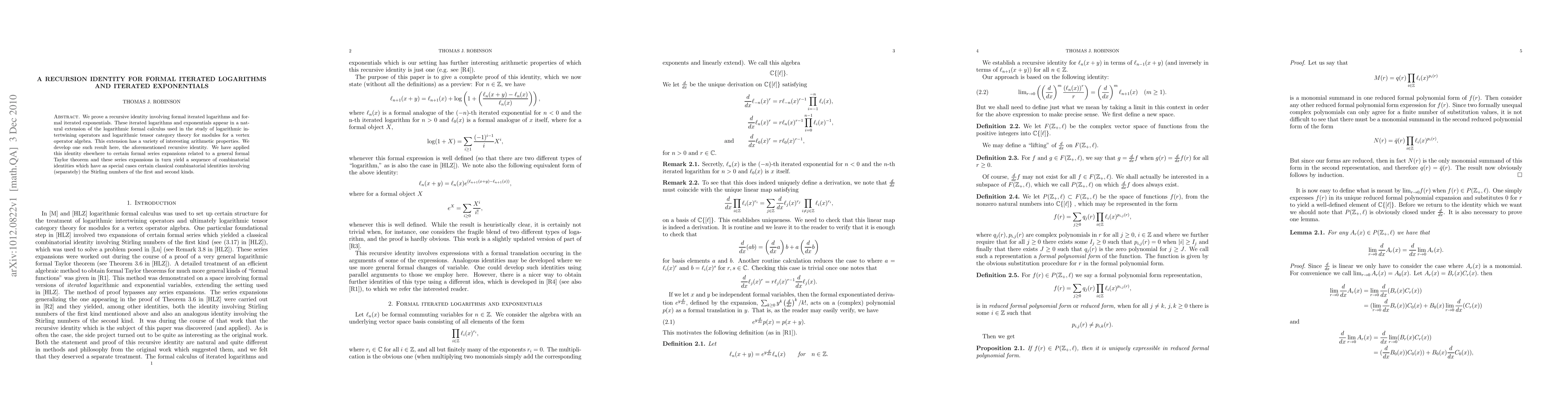 We prove a recursive identity involving formal iterated logarithms and formal iterated exponentials. These iterated logarithms and exponentials appear in a natural extension of the logarithmic formal calculus used in the study of logarithmic intertwining operators and logarithmic tensor category theory for modules for a vertex operator algebra. This extension has a variety of interesting arithmetic properties. We develop one such result here, the aforementioned recursive identity. We have applied this identity elsewhere to certain formal series expansions related to a general formal Taylor theorem and these series expansions in turn yield a sequence of combinatorial identities which have as special cases certain classical combinatorial identities involving (separately) the Stirling numbers of the first and second kinds.
