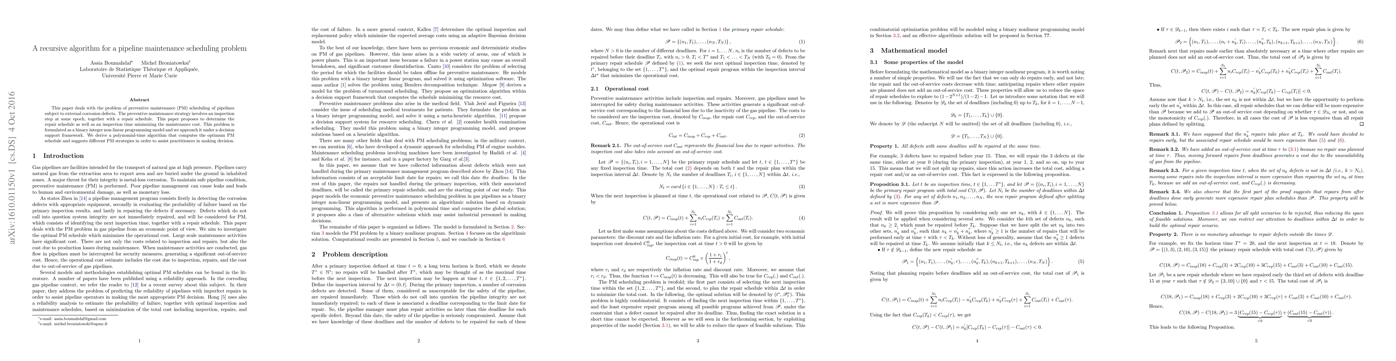 The paper proposes a recursive algorithm for a pipeline maintenance scheduling problem, formulated as a binary integer nonlinear programming model, to minimize maintenance costs by determining an optimal repair schedule and inspection time.
