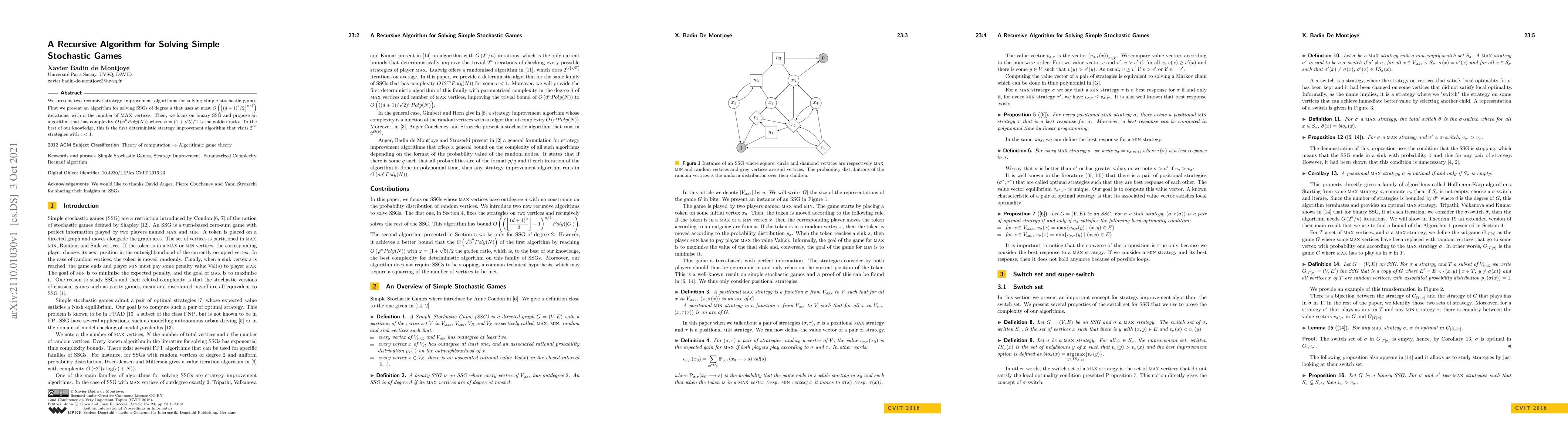 This paper introduces two recursive algorithms for solving simple stochastic games (SSGs), one with complexity $O\left(\left\lfloor(d+1)^2/2\right\rfloor^{n/2}\right)$ for general SSGs and another with complexity $O\left(\varphi^nPoly(N)\right)$ for binary SSGs, marking the first deterministic algorithm visiting $2^{cn}$ strategies with $c < 1$.