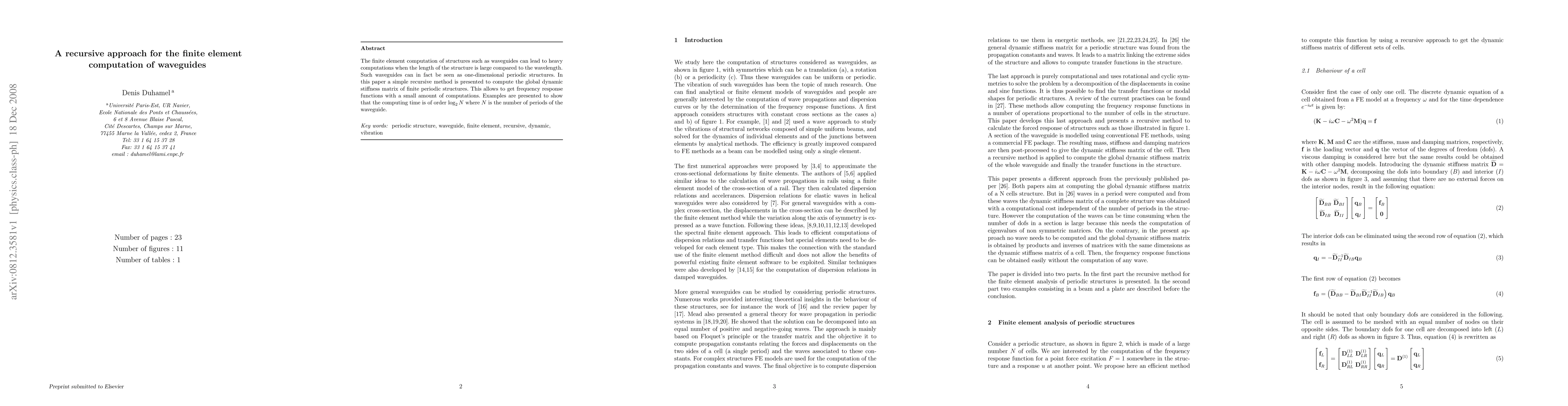 The finite element computation of structures such as waveguides can lead to heavy computations when the length of the structure is large compared to the wavelength. Such waveguides can in fact be seen as one-dimensional periodic structures. In this paper a simple recursive method is presented to compute the global dynamic stiffness matrix of finite periodic structures. This allows to get frequency response functions with a small amount of computations. Examples are presented to show that the computing time is of order $\log_2 N$ where $N$ is the number of periods of the waveguide.