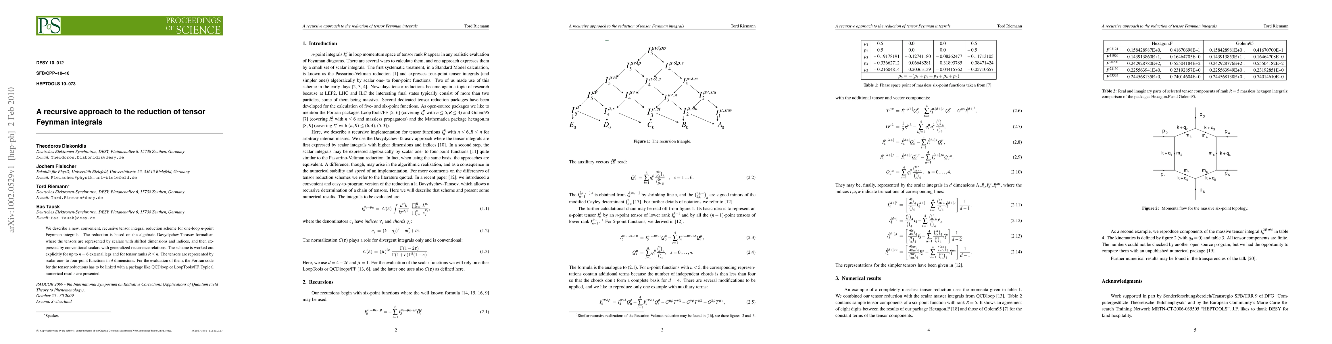 This paper introduces a recursive method for reducing tensor Feynman integrals in one-loop $n$-point scenarios using the Davydychev-Tarasov formalism, explicitly applied for $n$ up to 6 and tensor ranks up to $n$. The method employs scalar representations with shifted dimensions and recurrence relations, and integrates with Fortran code linked to QCDloop or LoopTools/FF for numerical evaluation.