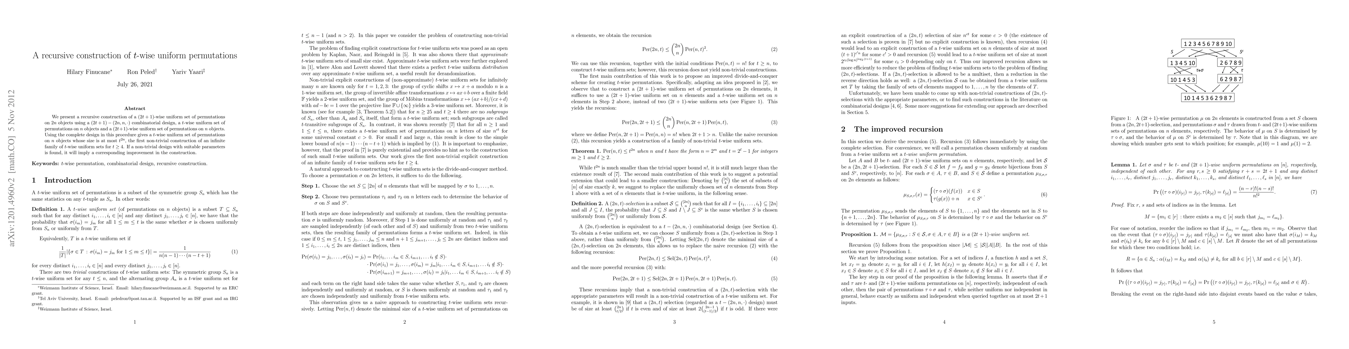 This paper introduces a recursive method to construct (2t + 1)-wise uniform permutations on 2n objects using combinatorial designs and existing uniform permutation sets. It provides the first non-trivial infinite family of t-wise uniform sets for t ≥ 4, with a construction size of at most t^2n.