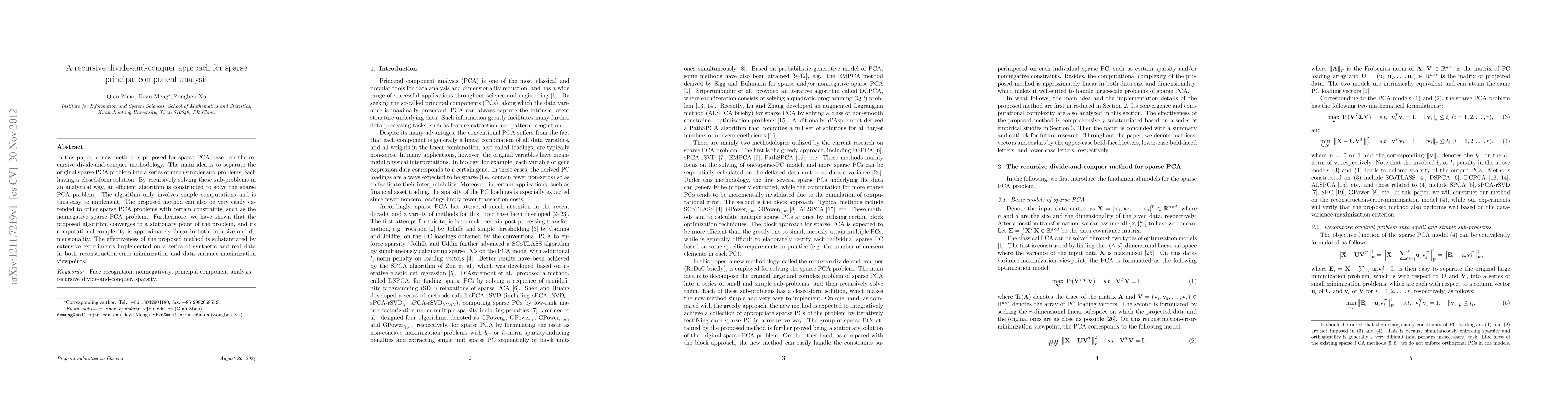 This paper introduces a recursive divide-and-conquer algorithm for sparse PCA, breaking down the problem into simpler sub-problems with closed-form solutions. The method is computationally efficient and easily extendable, with linear complexity and demonstrated effectiveness through experiments on synthetic and real data.