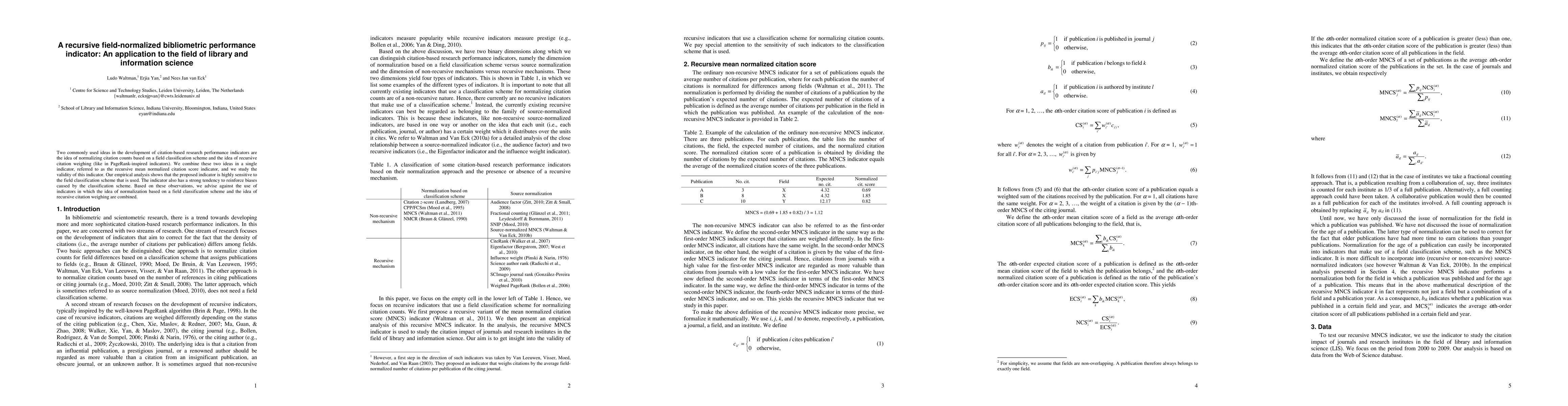 A new bibliometric performance indicator combines field normalization with recursive citation weighing, but its validity is limited due to sensitivity to field classification schemes and reinforcement of biases.