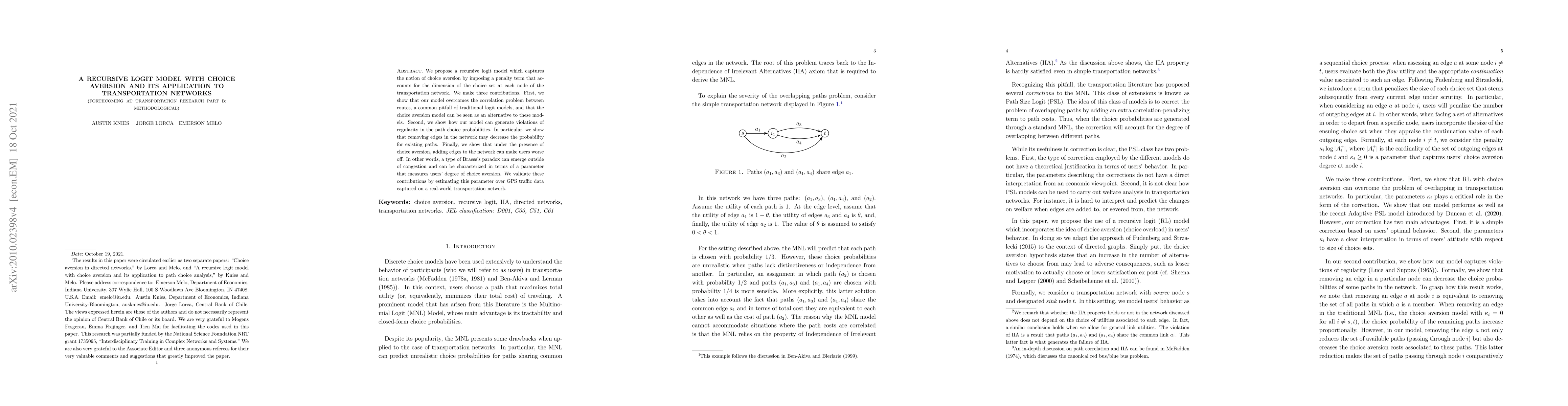 We propose a recursive logit model which captures the notion of choice aversion by imposing a penalty term that accounts for the dimension of the choice set at each node of the transportation network. We make three contributions. First, we show that our model overcomes the correlation problem between routes, a common pitfall of traditional logit models, and that the choice aversion model can be seen as an alternative to these models. Second, we show how our model can generate violations of regularity in the path choice probabilities. In particular, we show that removing edges in the network may decrease the probability for existing paths. Finally, we show that under the presence of choice aversion, adding edges to the network can make users worse off. In other words, a type of Braess's paradox can emerge outside of congestion and can be characterized in terms of a parameter that measures users' degree of choice aversion. We validate these contributions by estimating this parameter over GPS traffic data captured on a real-world transportation network.