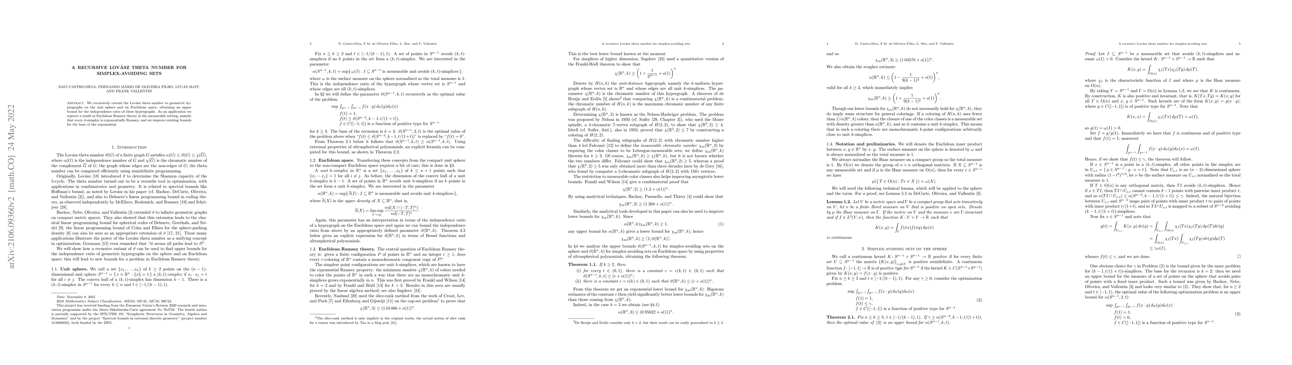 We recursively extend the Lov\'asz theta number to geometric hypergraphs on the unit sphere and on Euclidean space, obtaining an upper bound for the independence ratio of these hypergraphs. As an application we reprove a result in Euclidean Ramsey theory in the measurable setting, namely that every $k$-simplex is exponentially Ramsey, and we improve existing bounds for the base of the exponential.