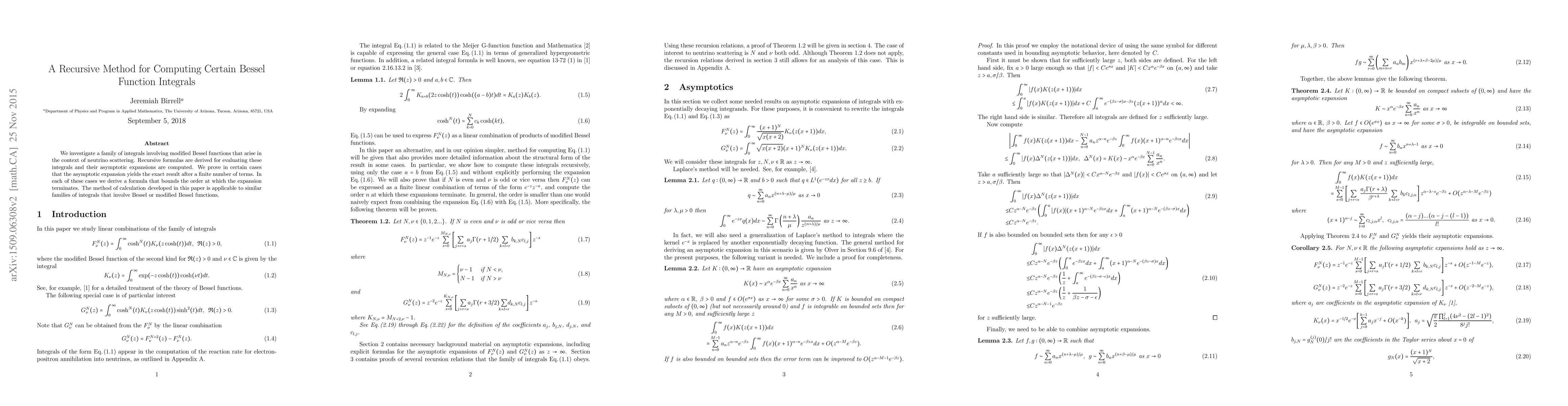 This paper develops recursive methods for evaluating integrals involving modified Bessel functions, which arise in neutrino scattering. The authors derive formulas and prove that in specific cases, the asymptotic expansion provides the exact result after a finite number of terms, with a derived formula to bound the order of termination.