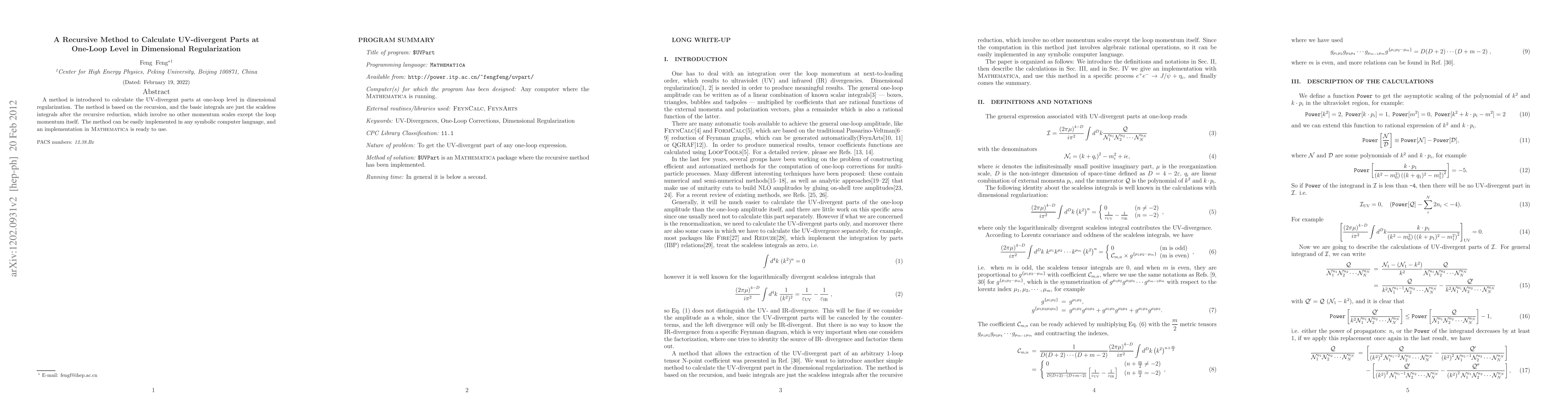 Summary: This paper introduces a recursive method for calculating UV-divergent parts at one-loop level in dimensional regularization, relying on scaleless integrals and easily implementable in symbolic computation software like Mathematica. The method simplifies the calculation process by reducing basic integrals to those involving only the loop momentum.